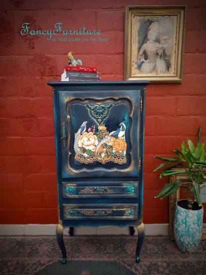 Deze koninklijke blauwe kast staat mooi hoog op haar poten, een mooie donkerblauwe tint heeft ze gekregen met turquoise en gouden details en een heerlijk opvallende transfer van oranje met gouden vogels.... Deze kast geeft je vleugels.