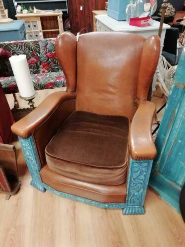 Lederen fauteuil in de kleur cognac en met mooie bewerking in de kleur turquoise