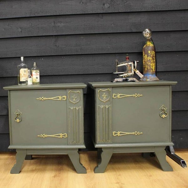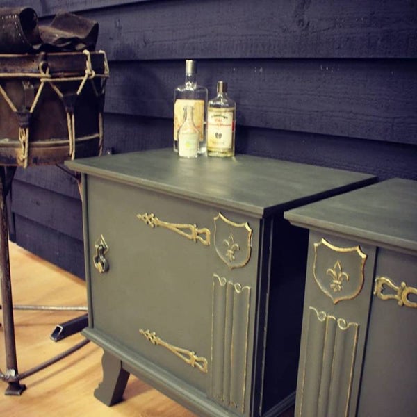 set van 2 nachtkastjes in de kleur Military Bronze met een touch of gold van wise owl paint.