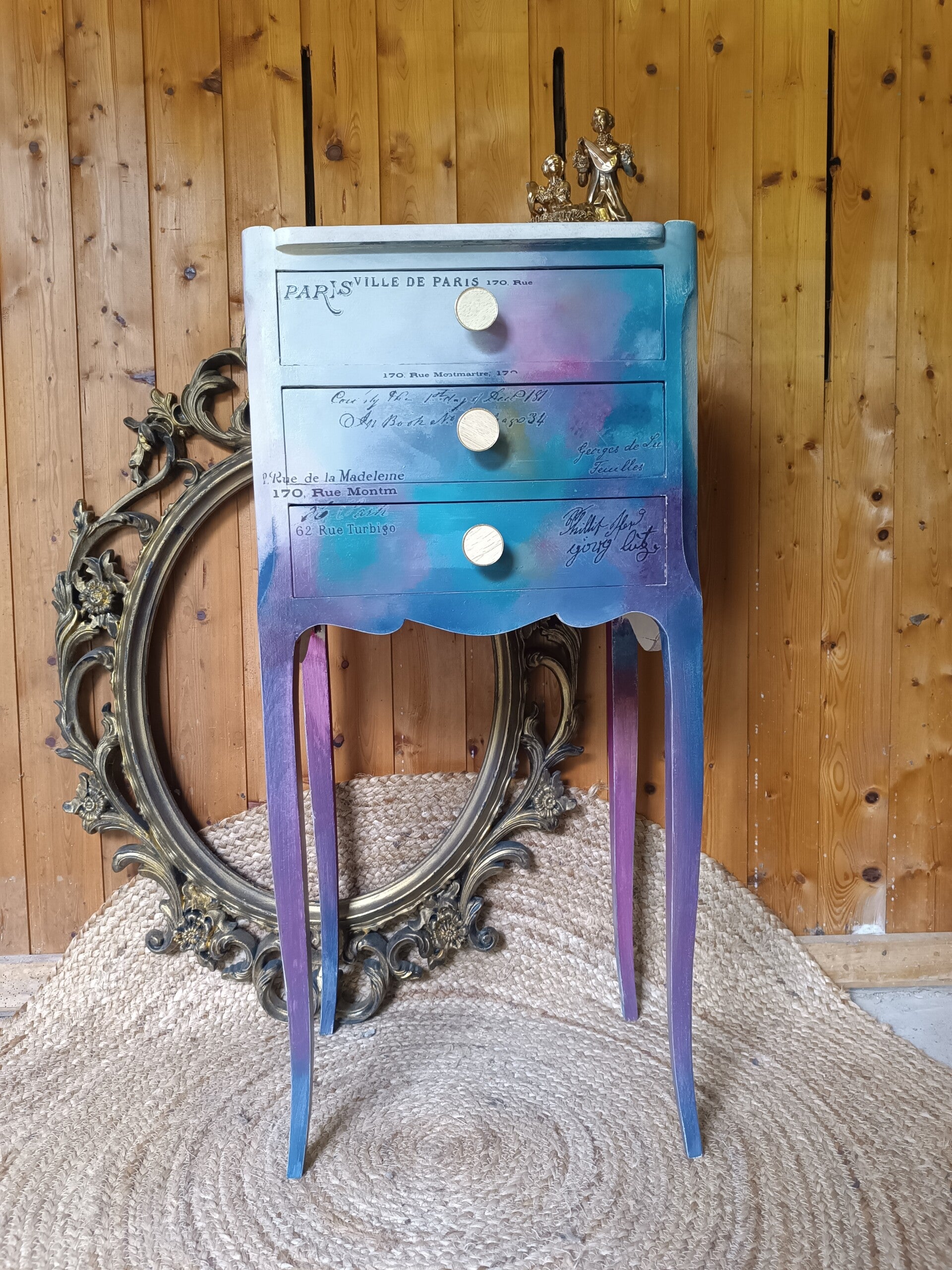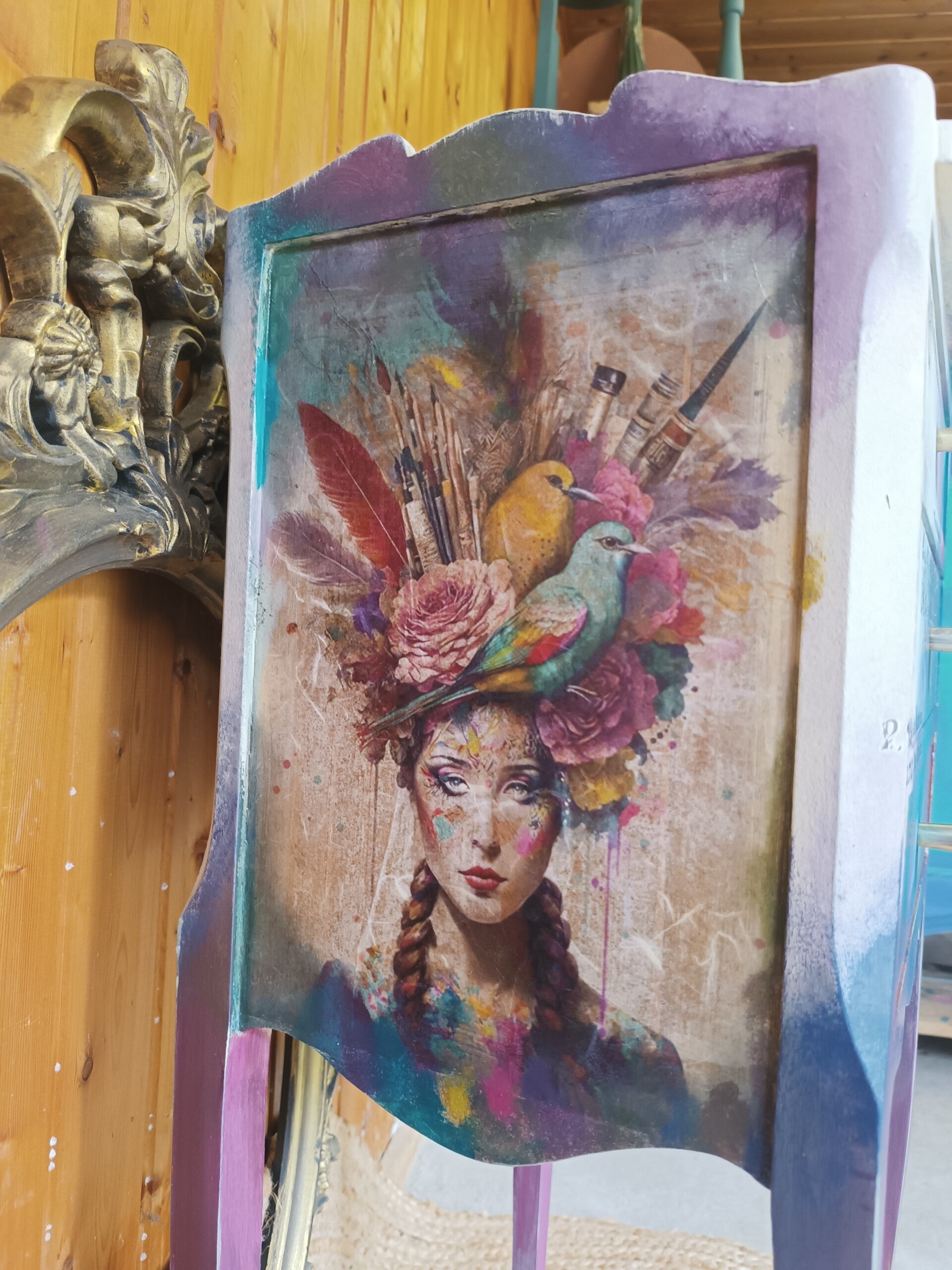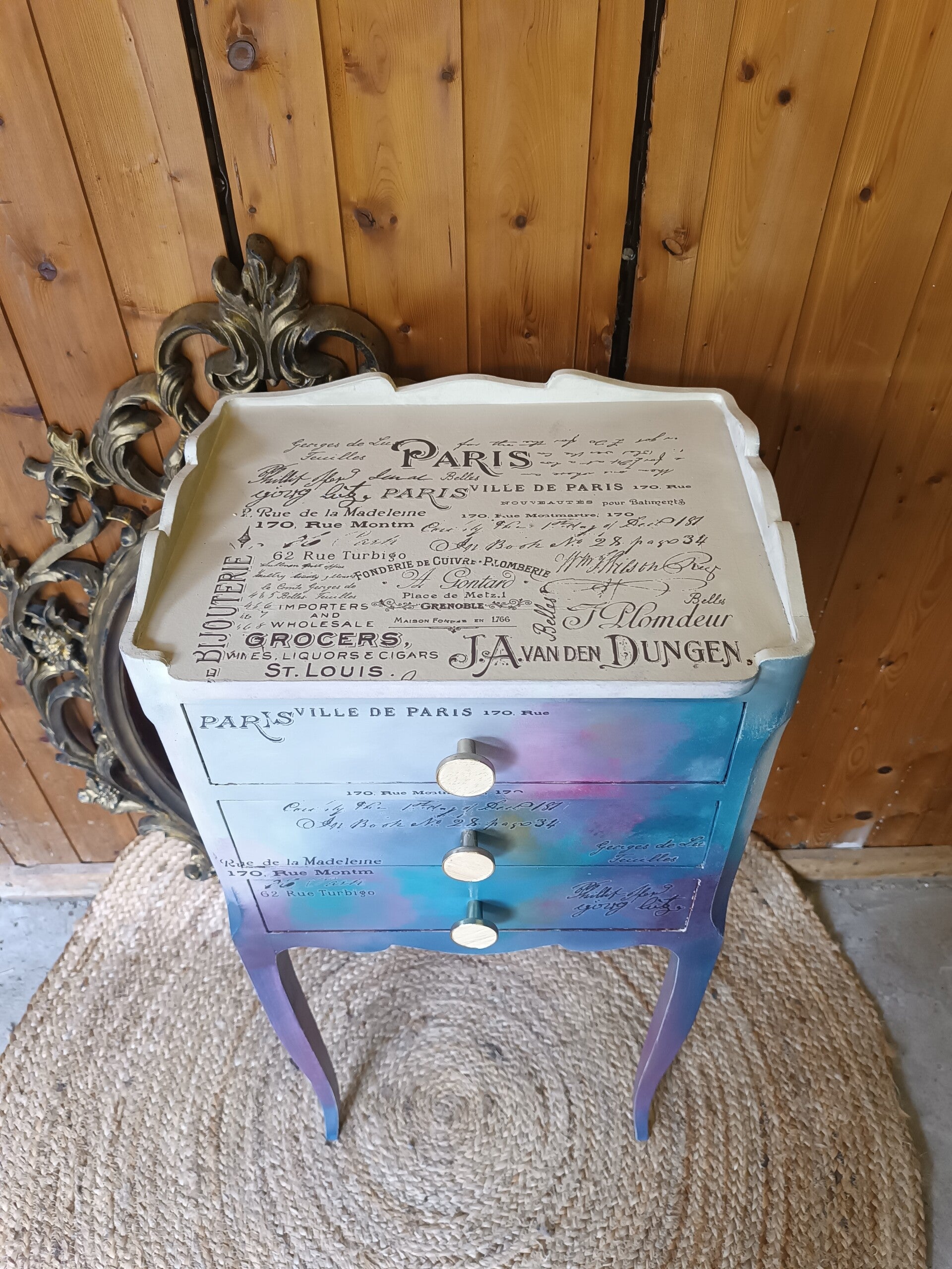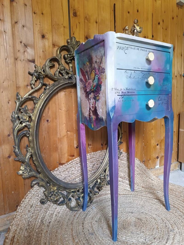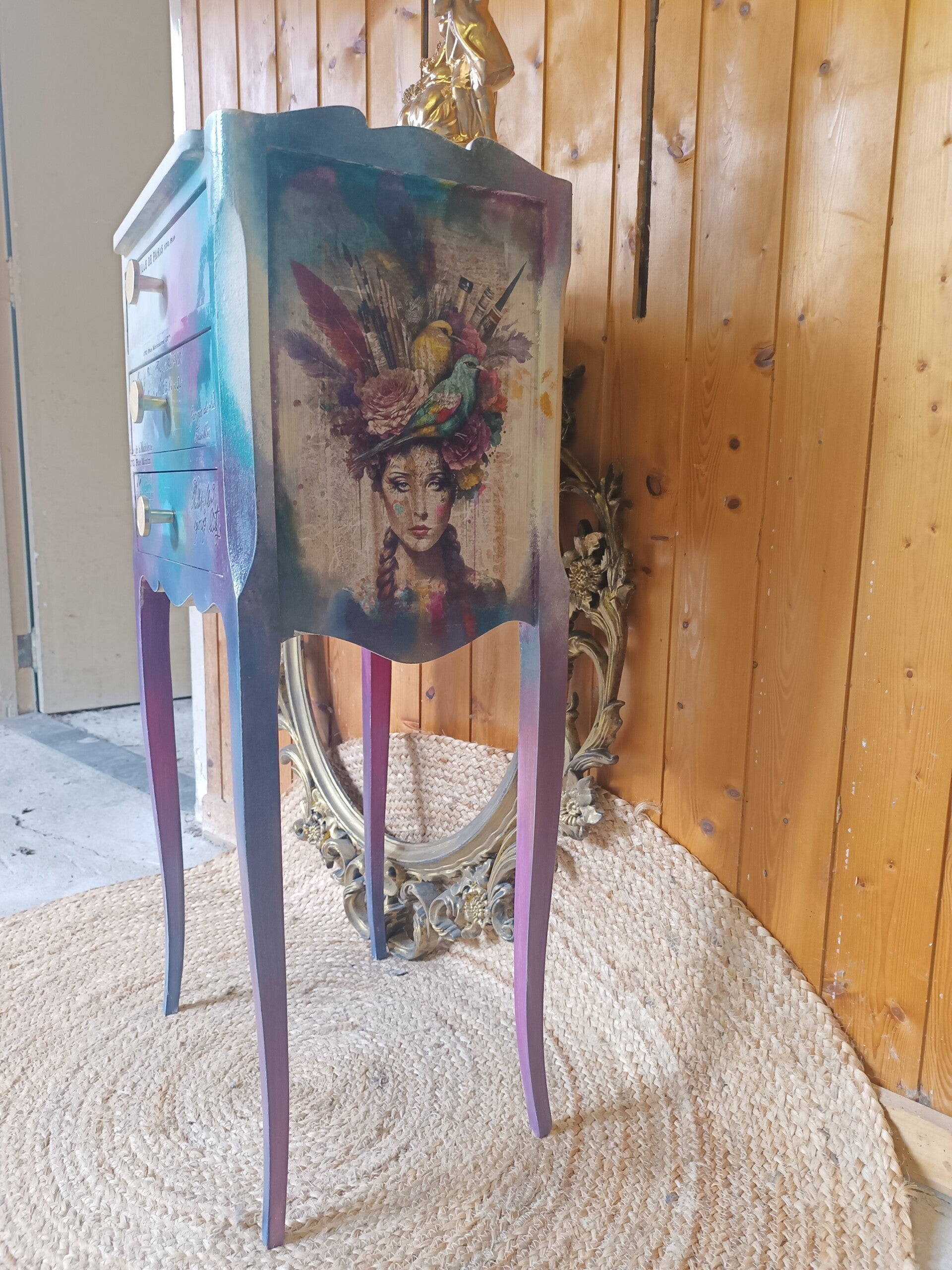 Een mooi hoog ladekastje met aan beide zijdes een prachtige afbeelding, de kleuren die in de afbeelding zitten, heb ik terug laten komen in de hoge pootjes en de voorkant.