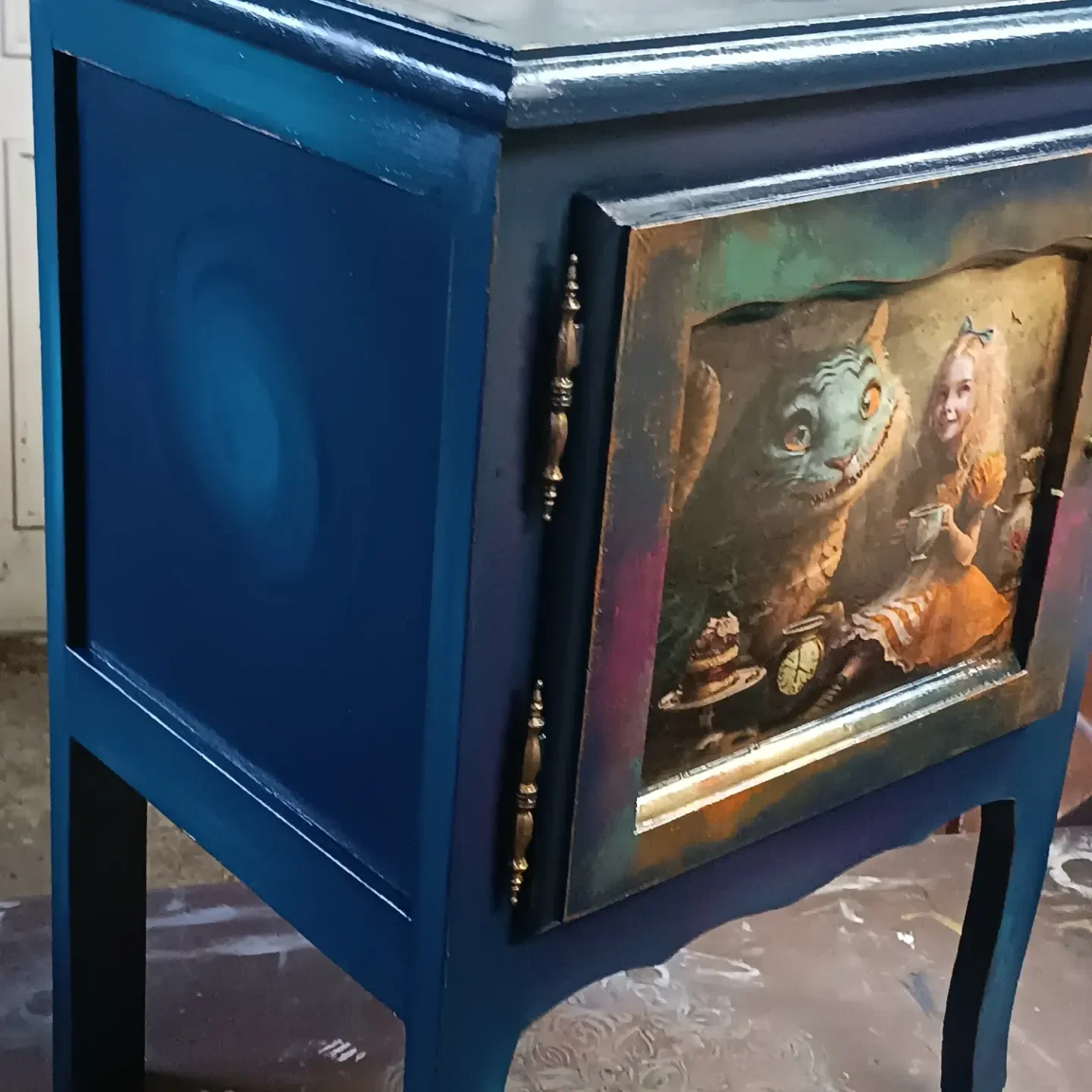 Een kastje met Alice nippend van een theekopje in conversatie met Chesire cat.