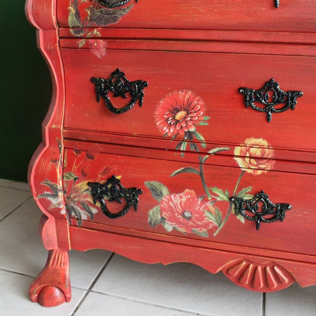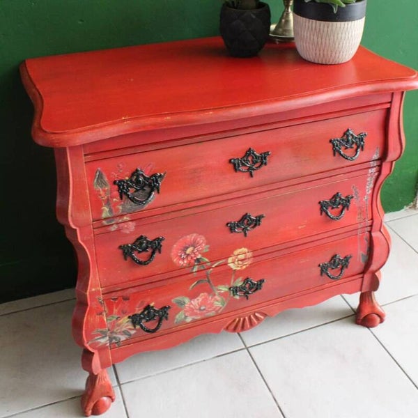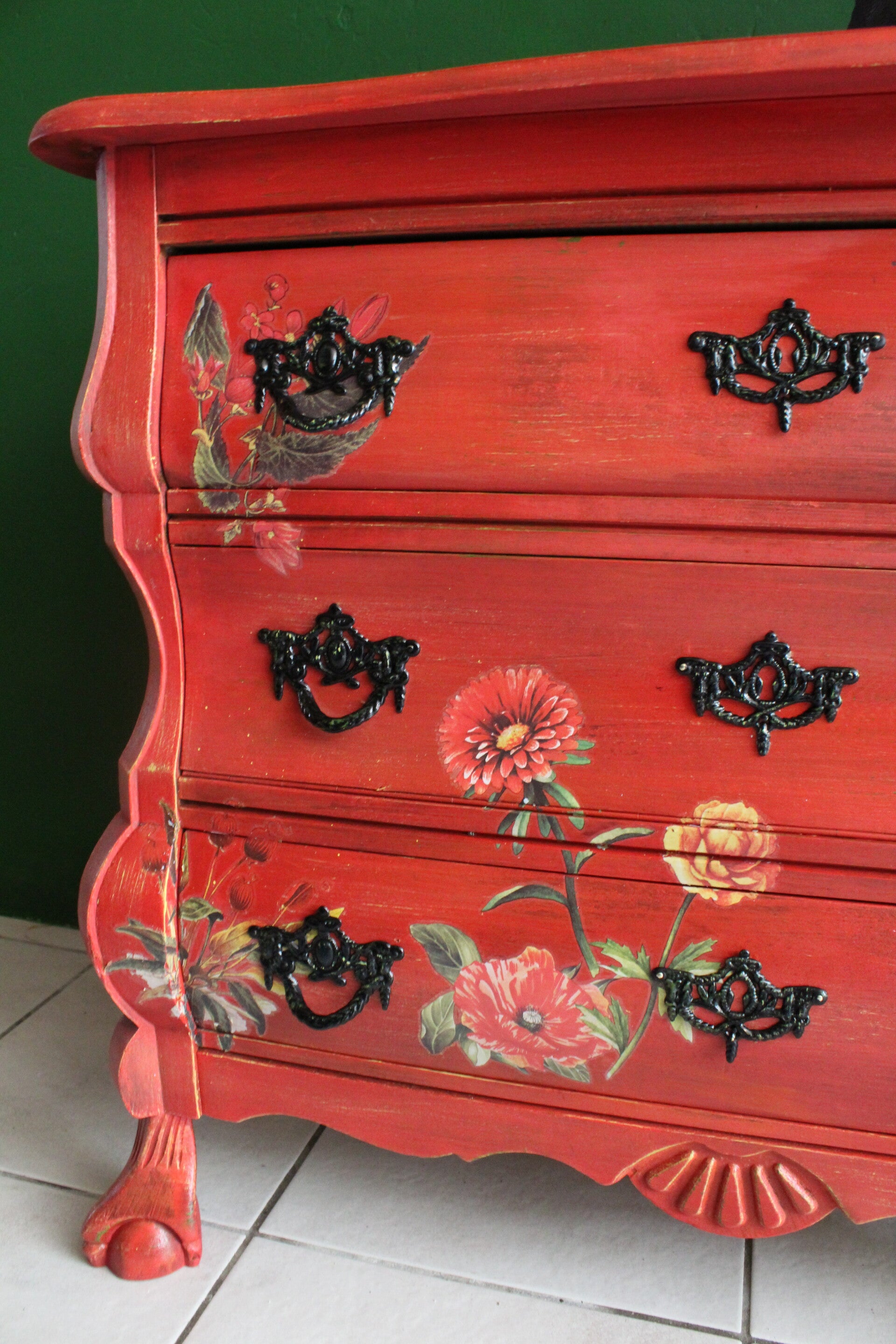Dit prachtige buikkastje is in de kleur poppy geschilderd met mooie bloemen transfers erop.. De onderste is een lad de bovenste 2 is een klep... Leuk en apart