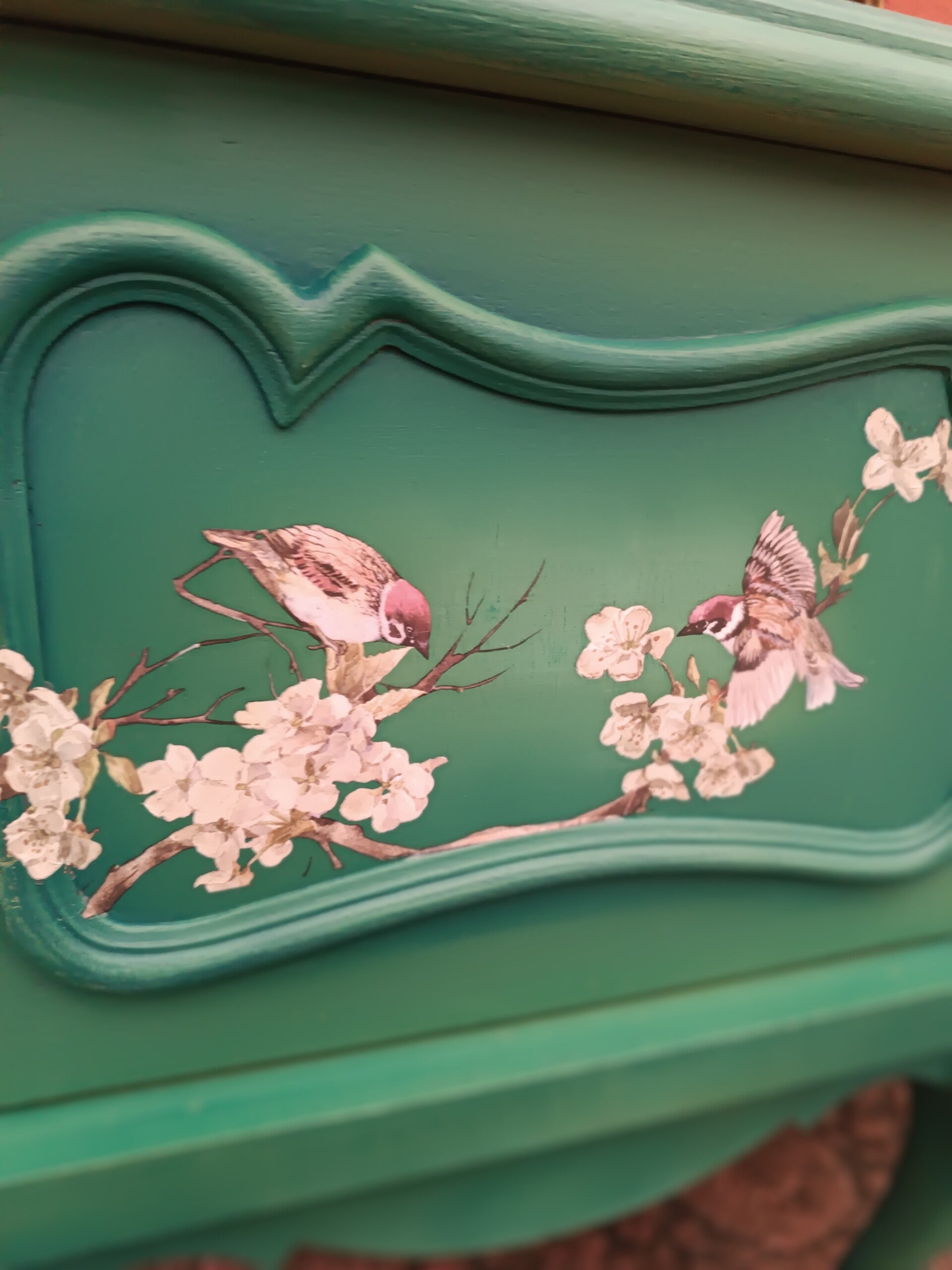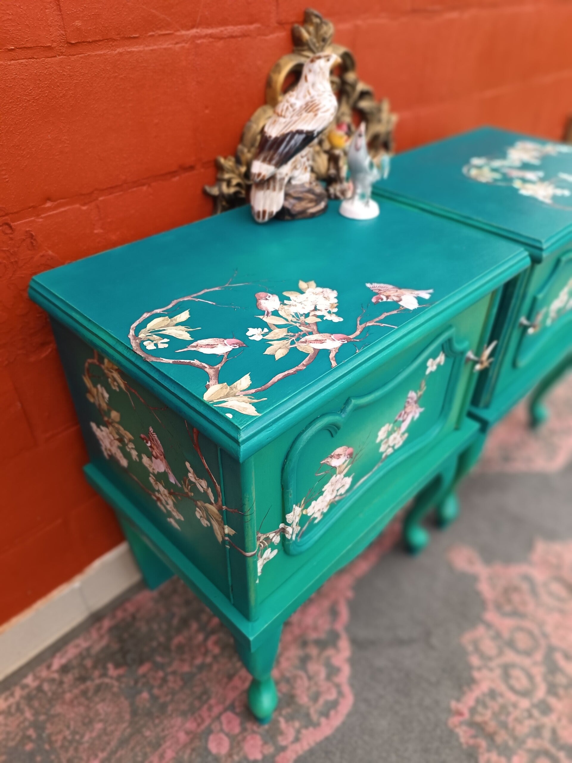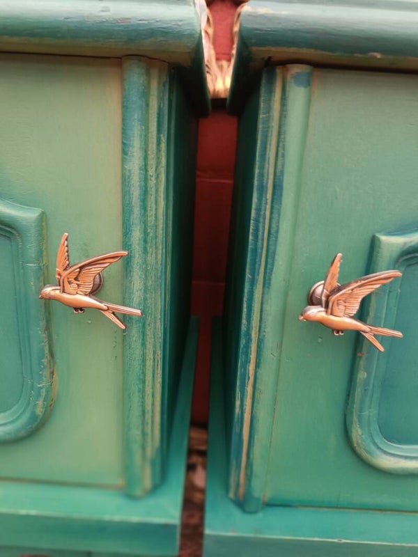 Set van twee sierlijke nachtkastjes in verschillende tinten groen geblend, een transfer van vogels en twee prachtige bijpassende meubel knopjes