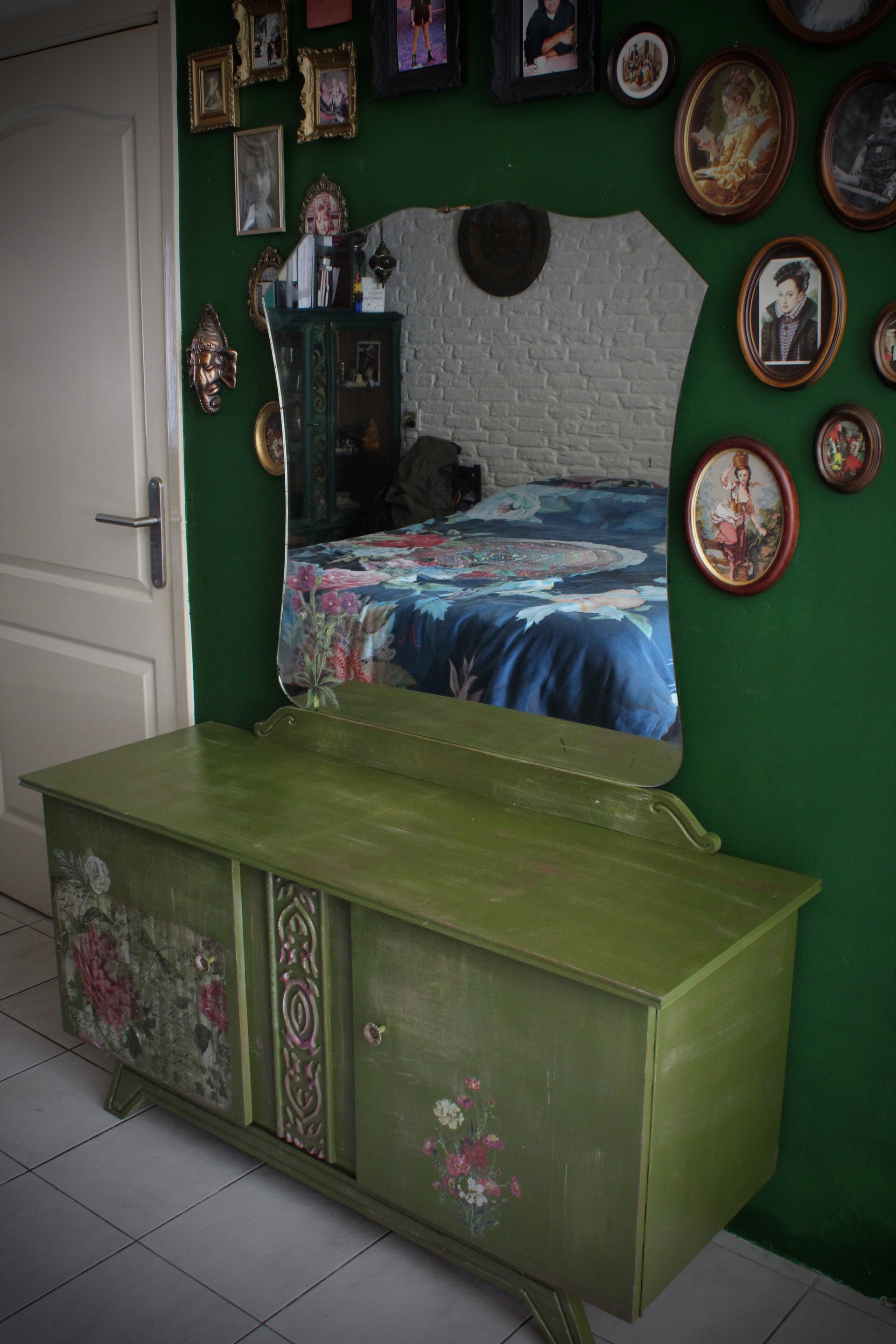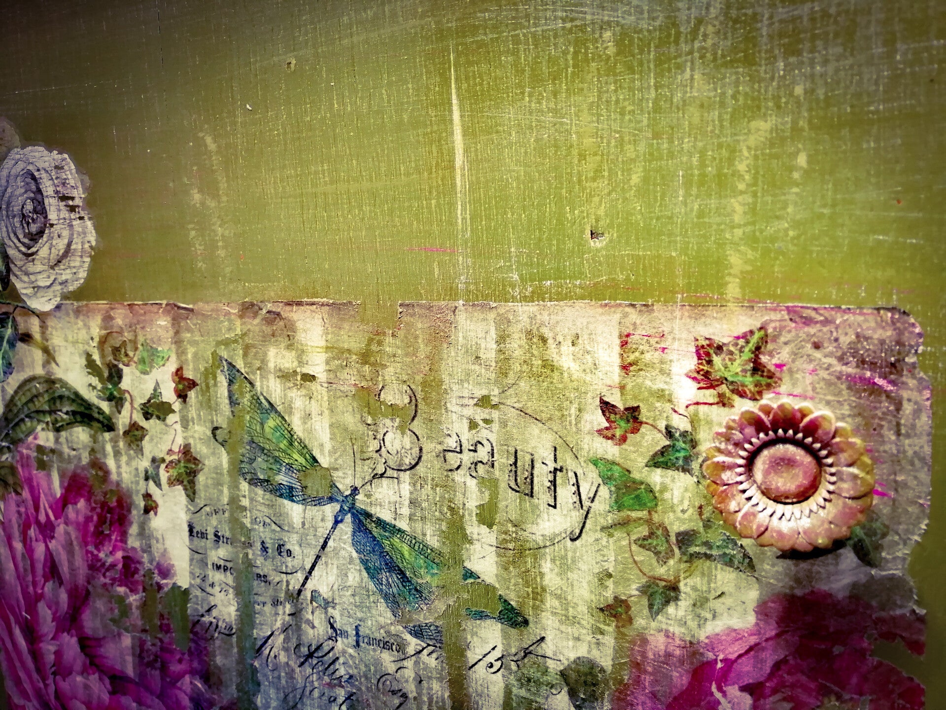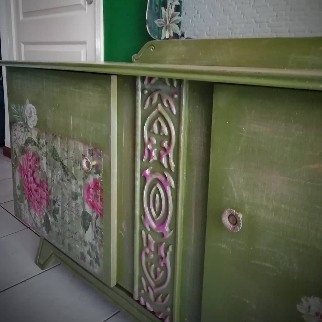 Kaptafel in de kleur olive green met decoupage techniek en bloementransfer gesealed met de furniture salve