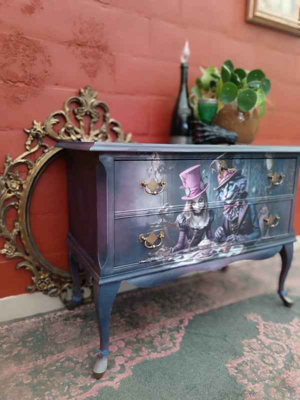 Je waant je bij deze kast heerlijk in het paarse wonderland samen met Alice en Chesire hat cat.... Een mooie paarse kleur geblend samen met donkerblauw en lila van het merk anniesloan ... Een decoupage afbeelding van @decoupangel op de voorzijde en is in 1 geheel geschilderd door moi...