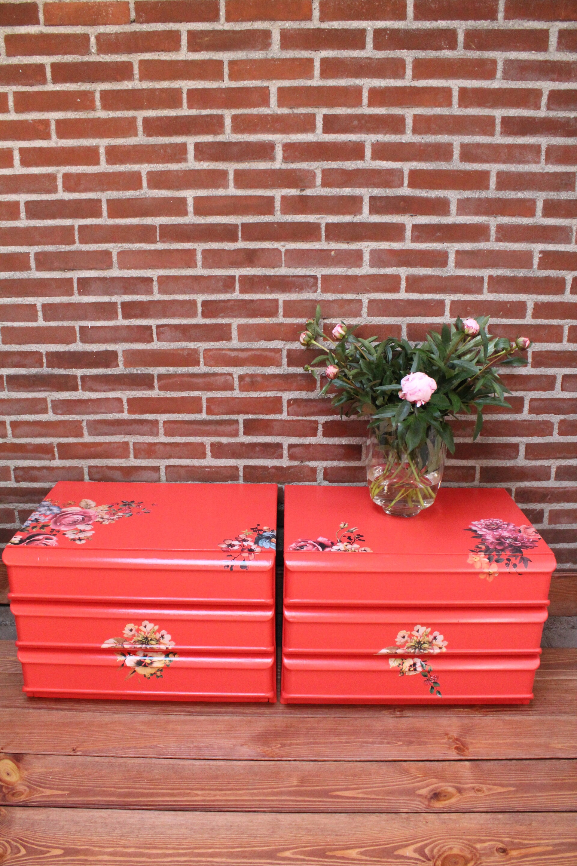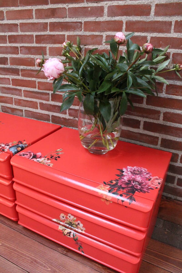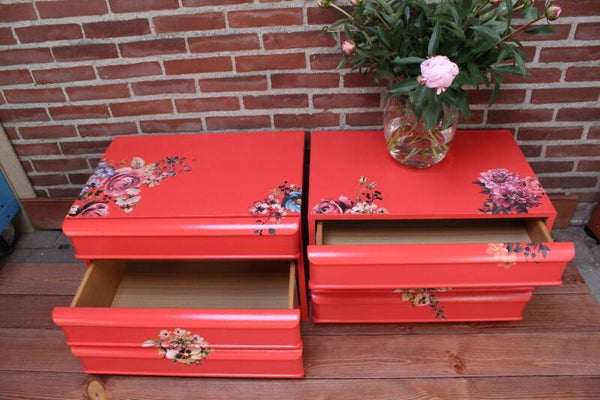 Set nachtkastjes in de heldere oranje kleur Madrid met een mooie bloementransfer erop