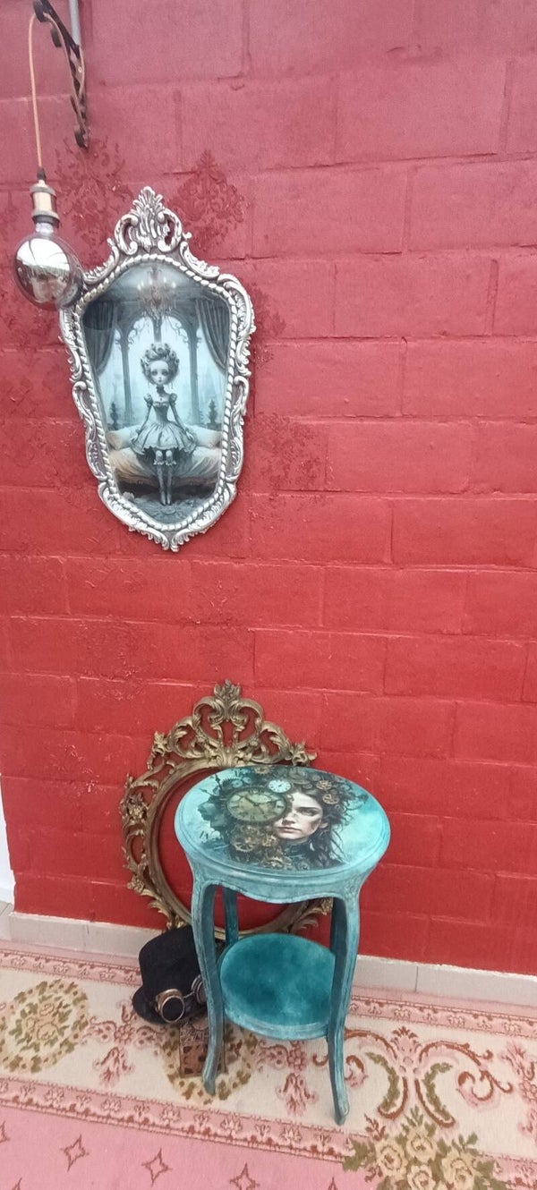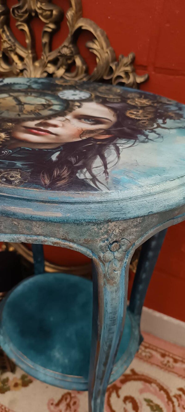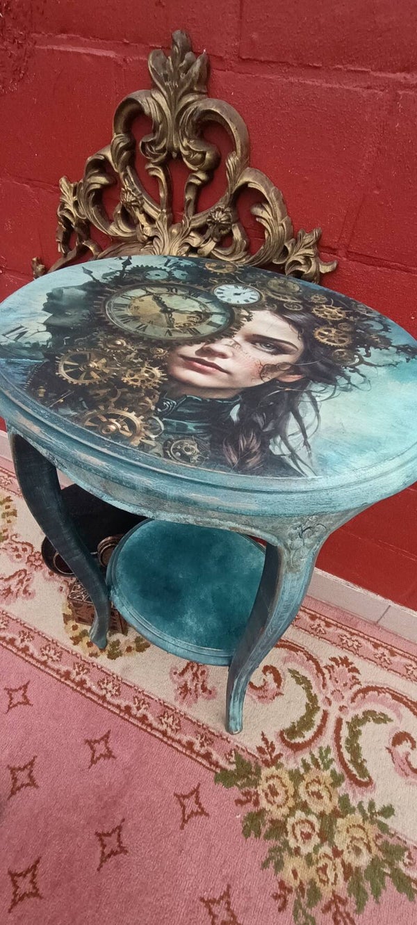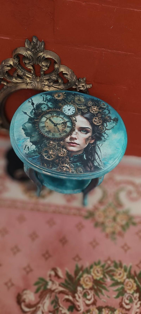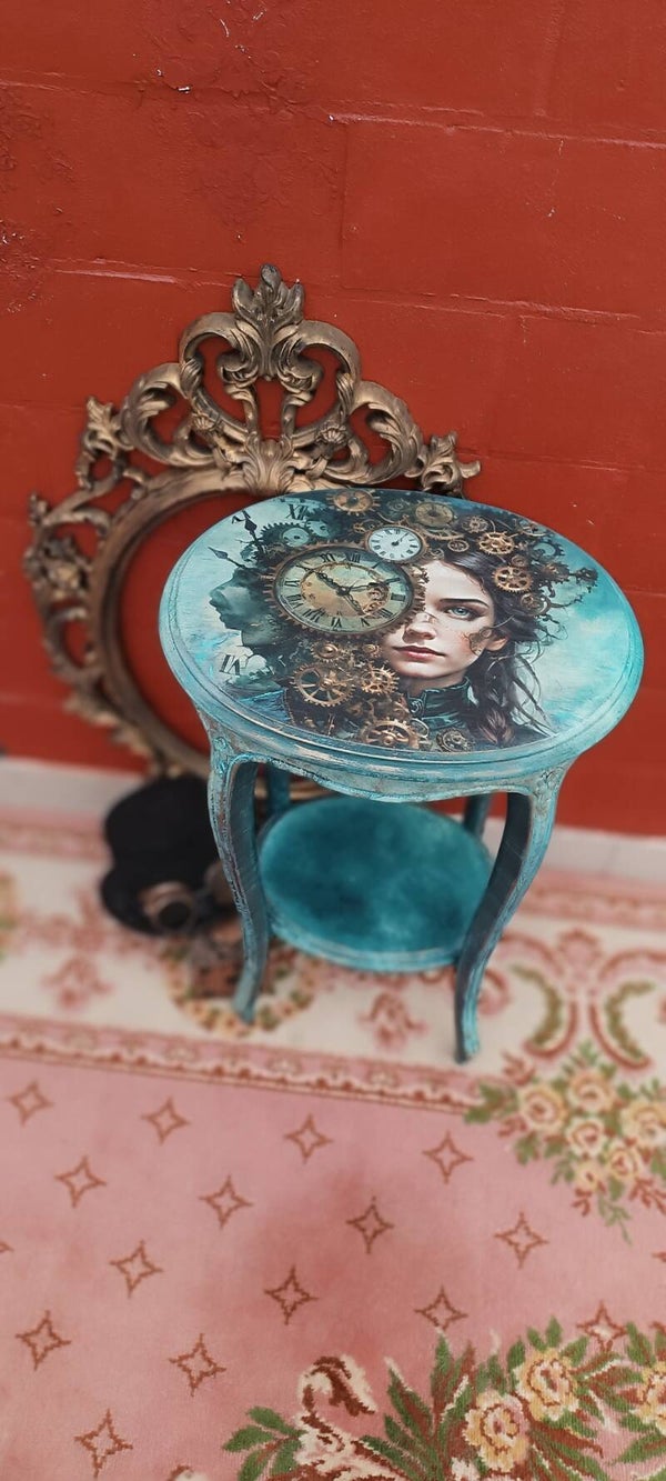Dit unieke in steampunk stijl bijzettafeltje is voorzien van een prachtige decoupage afbeelding en heb ik de kleuren terug laten komen zodat het een mooi geheel word..