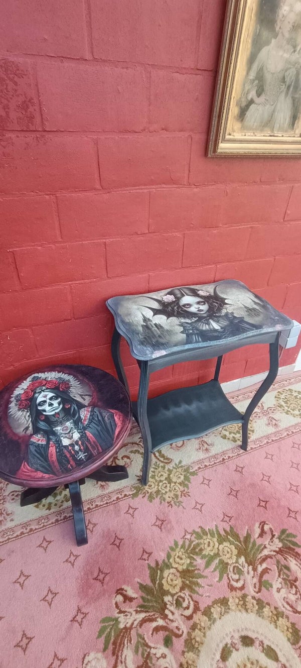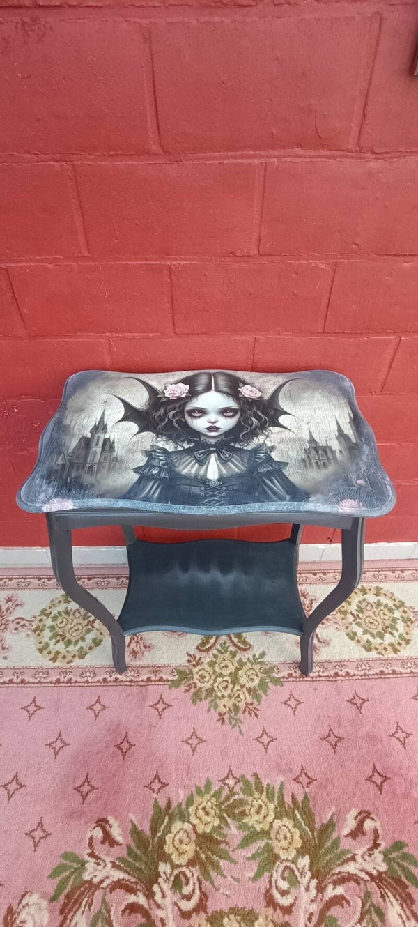 Een hoog bijzet tafeltje met een decoupage afbeelding van een gothic girl in de kleuren antraciet grijs en met lichte roze tinten erin