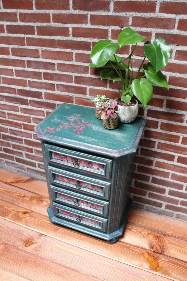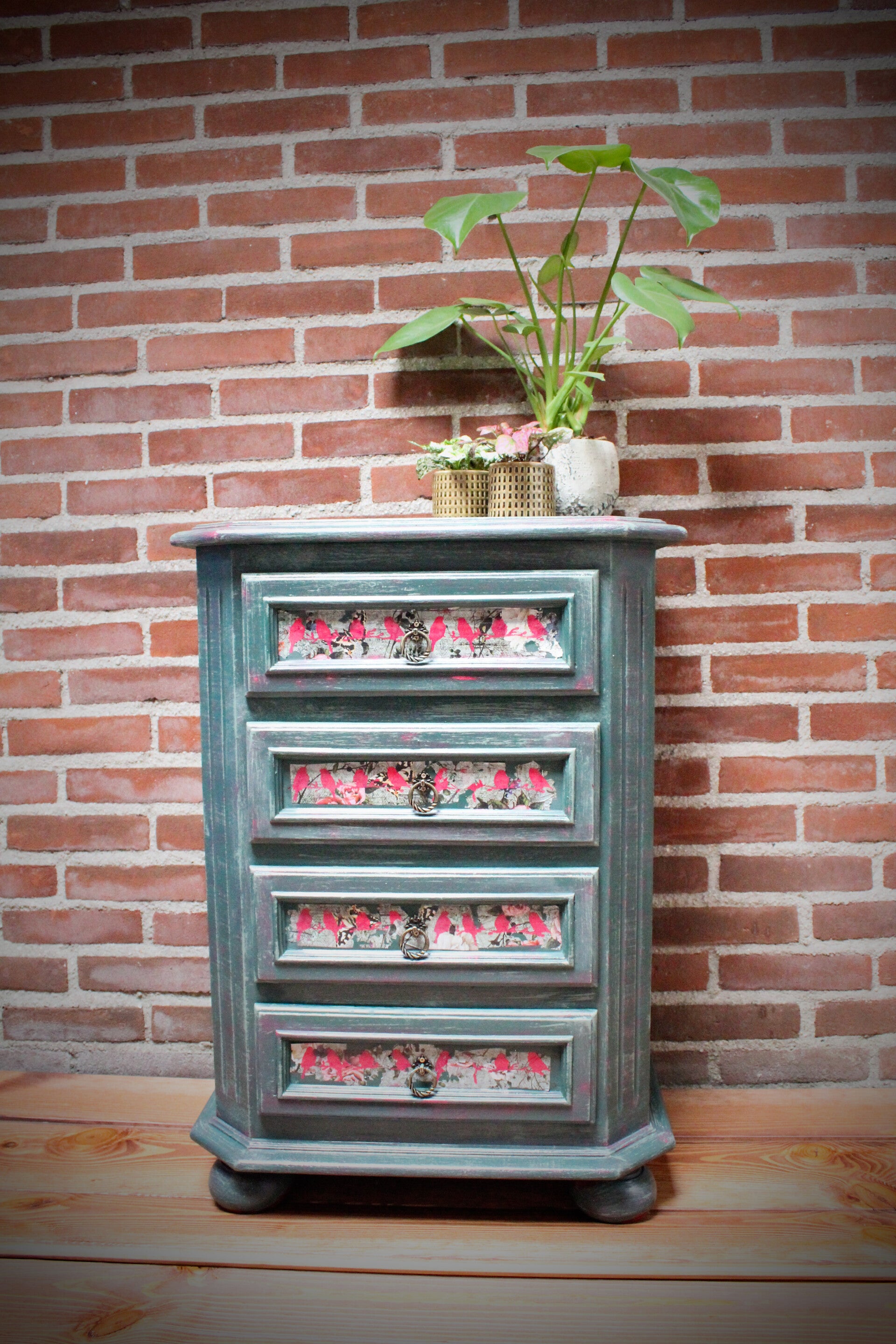 Groen ladekastje met 4 lades en een versleten look..leuke details