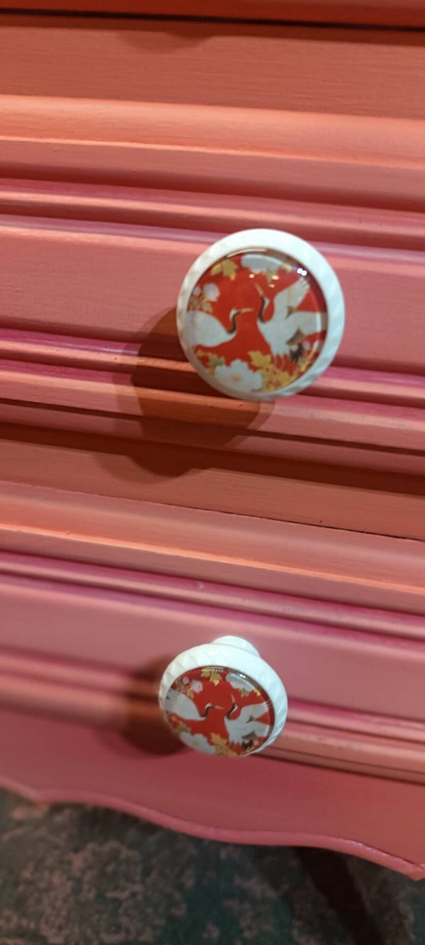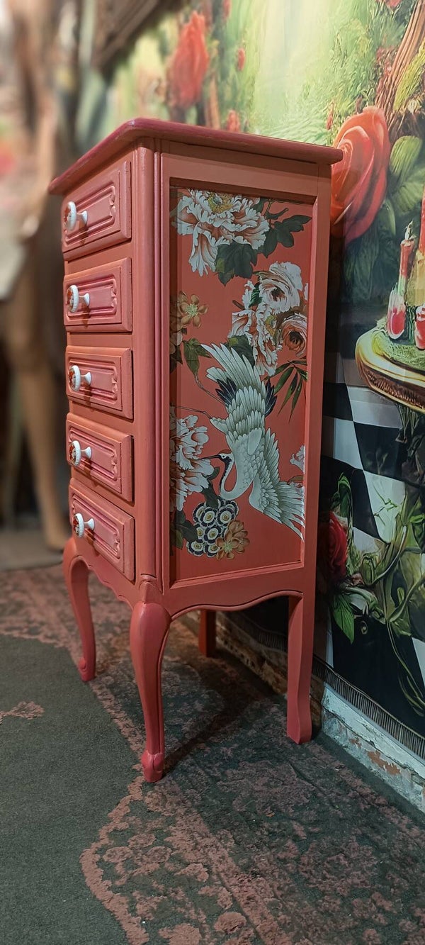 Met z'n charmante kleuren, elegante pootjes en die kraanvogels die duidelijk wél de memo over gratie hebben gekregen, is dit kastje klaar om je interieur een flinke dosis ‘wow’ te geven.