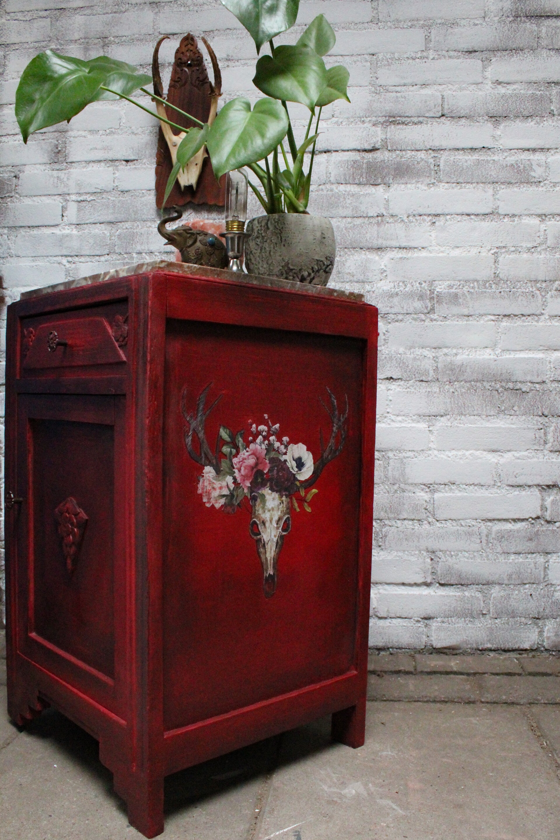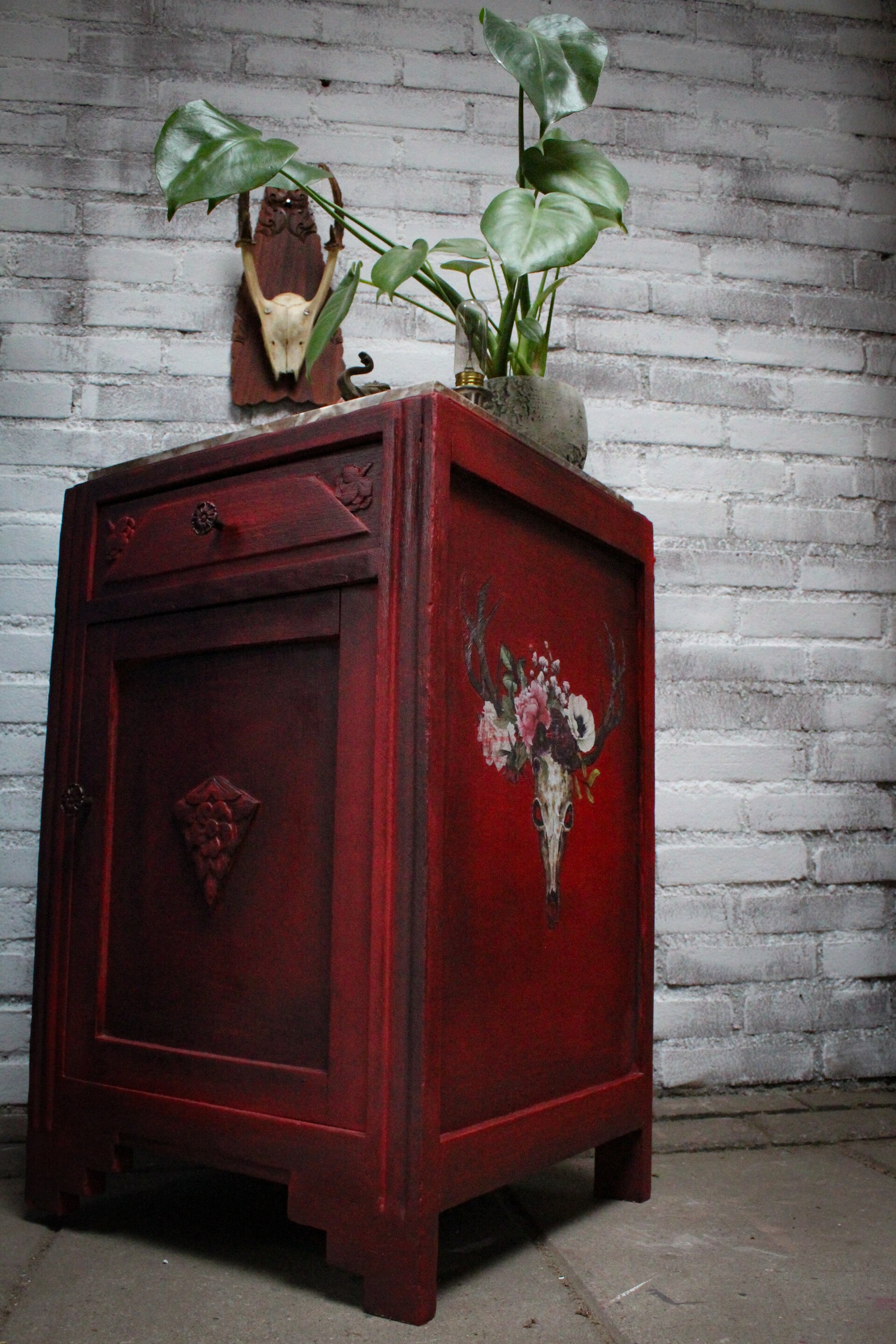 Een prachtig bewerkt kastje met marmeren plaat in verschillende tinten door elkaar, oud gemaakt en een mooie transfers van boho skulls aan beide kanten...mooi als halkastje, nachtkastje of op een slaapkamer etc etc