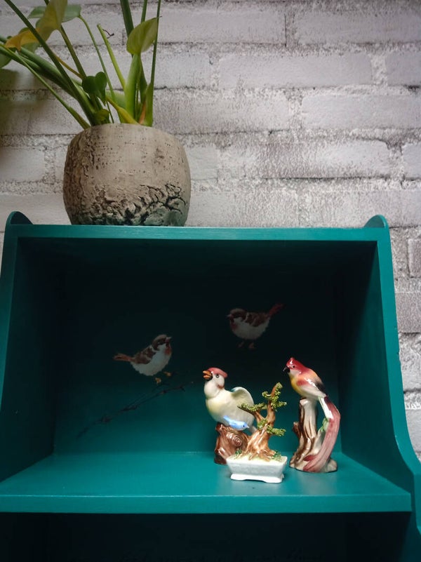 Hoog kastje , evt leuk voor in de hal of smalle muur, mooie kleur groen en transfers erop, afgewerkt met een furnituresalve