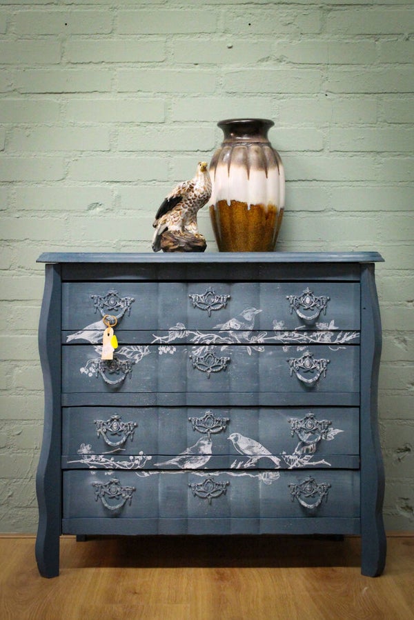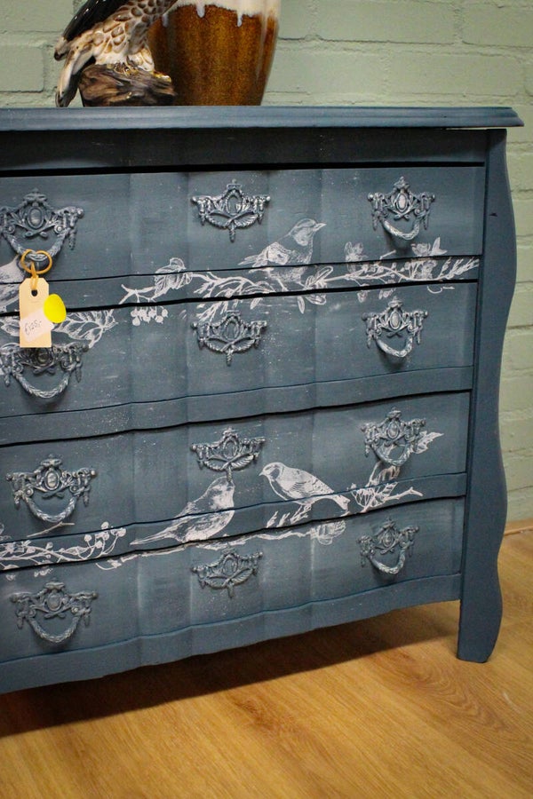 Ladekast in een mooie blauwe tint met vogeltjestransfer erop.