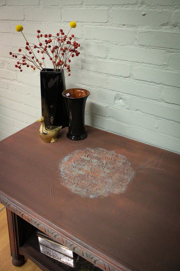 Leuke aparte tafel, met verweerd spiegelglas en glasplaat
