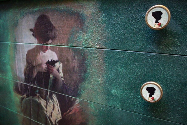 Een prachtige ladenkast met 4 lades in verschillende tinten groen, de afbeelding van "study in black&green" van de schilder John White..de bijpassende knopjes maken het helemaal af..