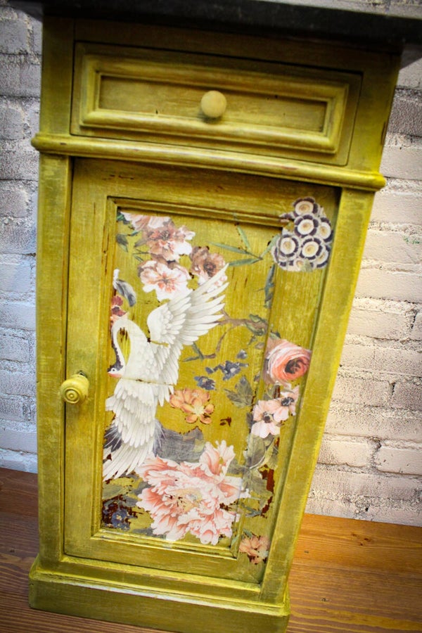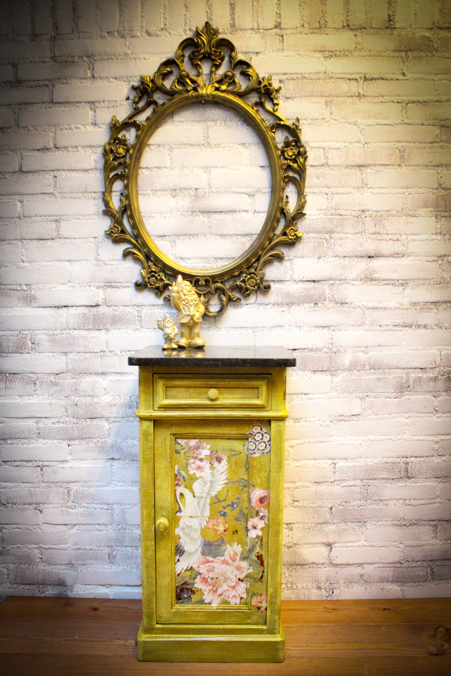 Geschilderd in een mosterdgele kleur en oud gemaakt met een chippy look...waardoor hij er oud uit ziet....