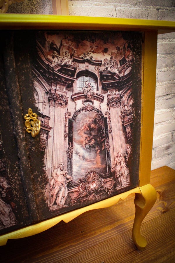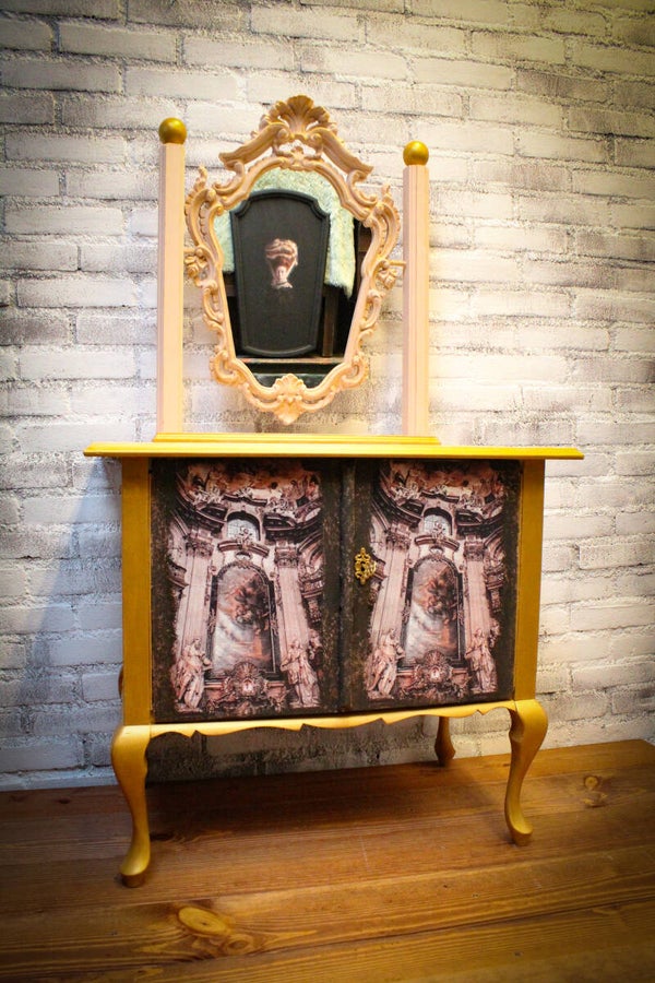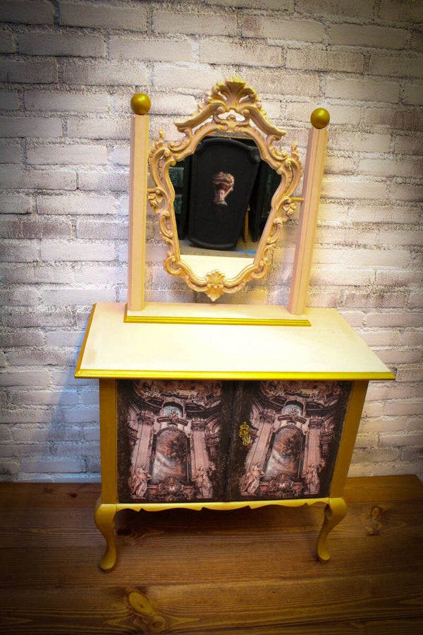 Ik heb dit kastje in een nude kleur geschilderd het is geen roze en ook geen beige maar ergens daar tussenin, een heel mooie en zachte tint, de gouden randen en de afbeelding van de Renaissance tijd geven het kastje en de spiegel een heerlijke barok uitstraling, sjiek de friemel zoals ik het noem.
