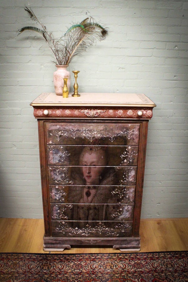 Deze prachtige ladekast heeft 6 grote lades en bovenin nog een smalle lade, dus heel veel opbergruimte, een unieke kast voor in je interieur.