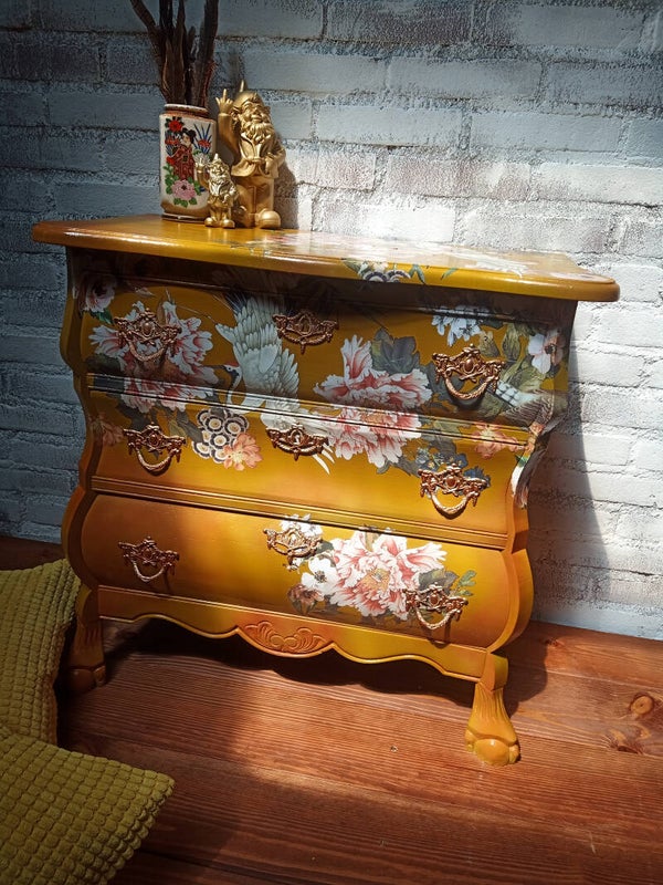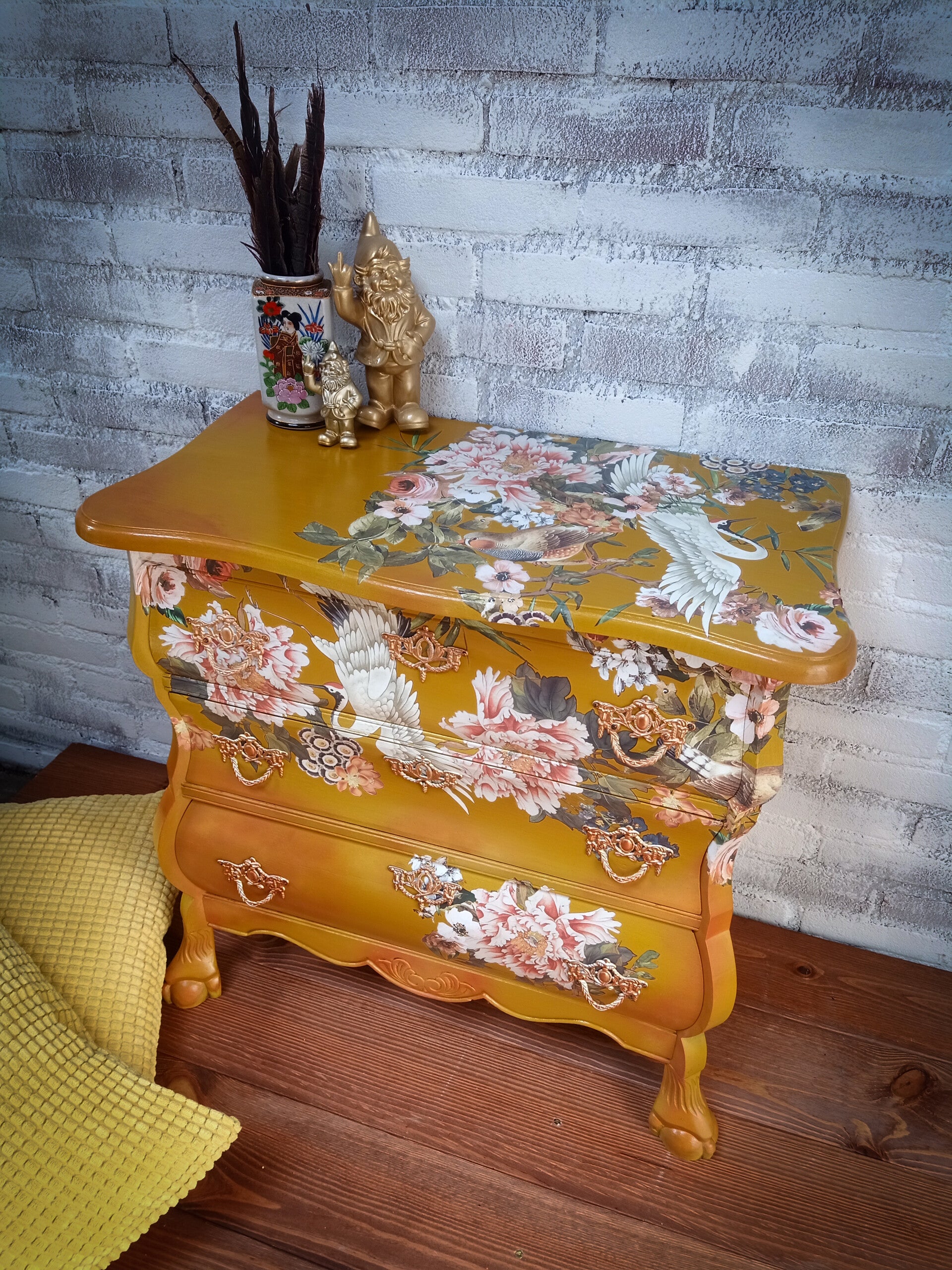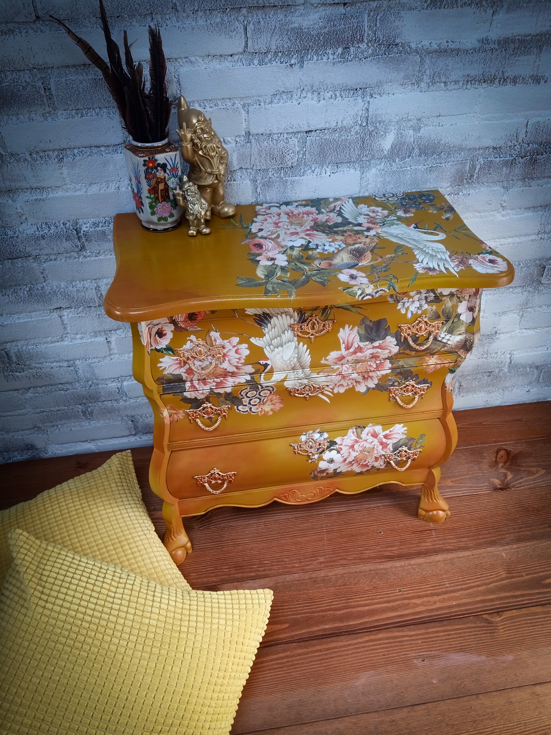 De kleur is Dijon een mosterdgele kleur en heb metallic rosé gold en citron voor de highlights gebruikt, een mooie transfer van kraanvogels en pioenrozen erop maakt het kastje helemaal af.