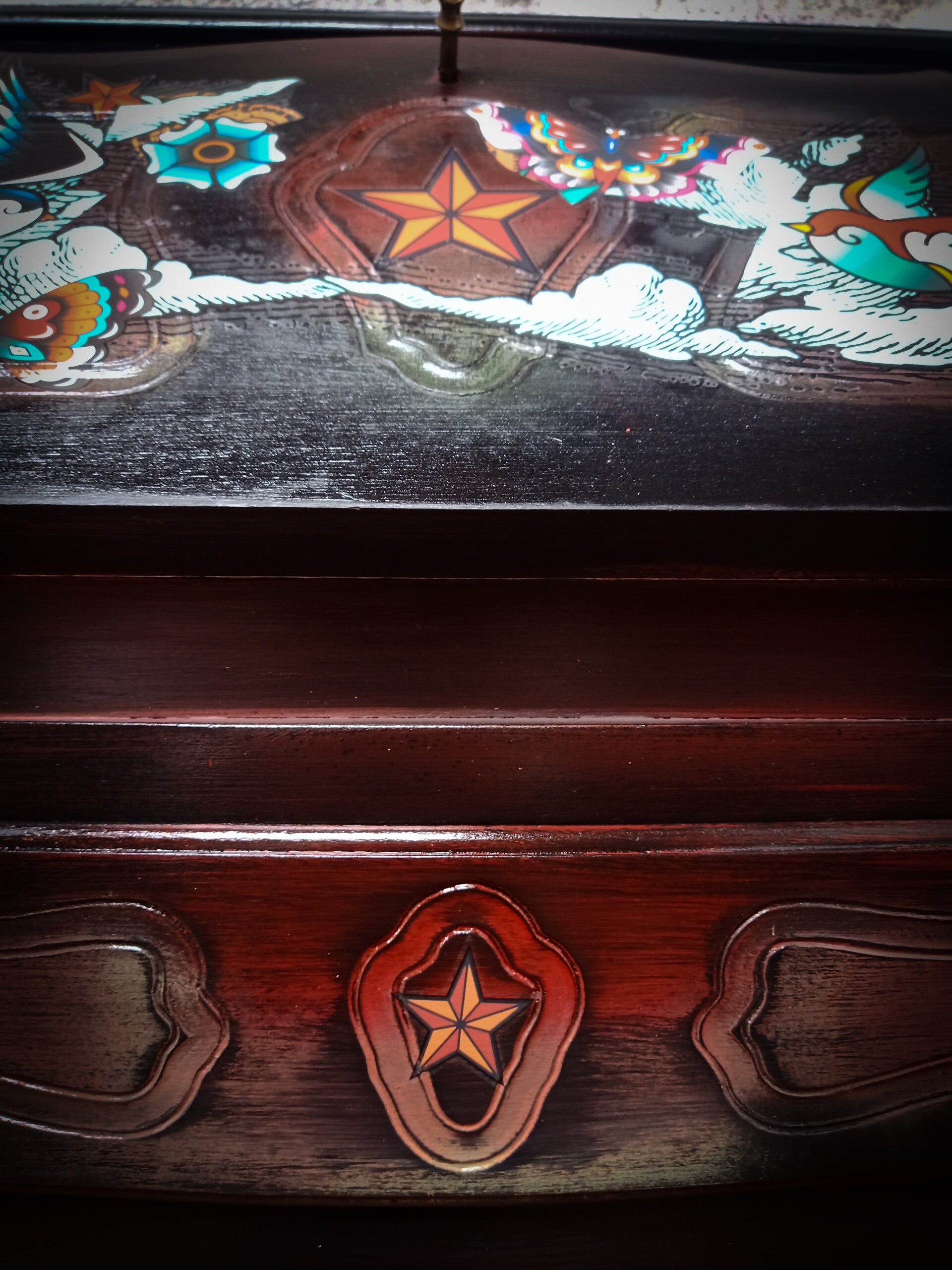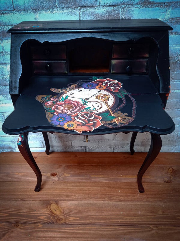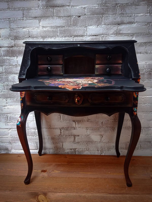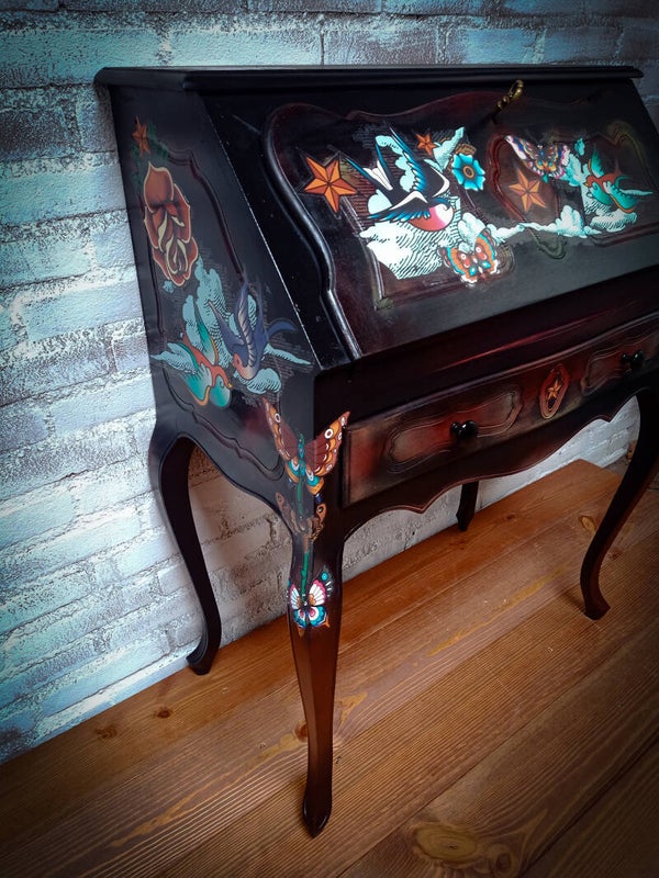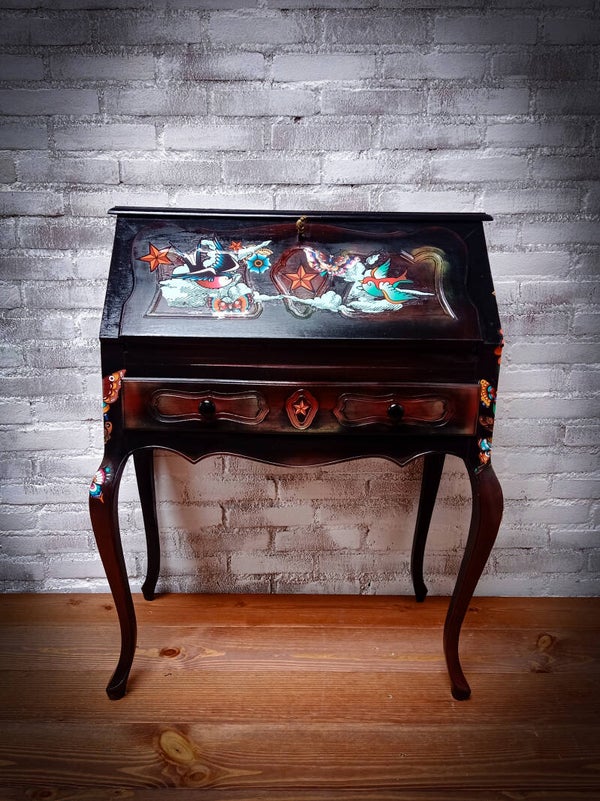 Secretaire met een transfer van oldskool tattoos, de basiskleur is zwart... 4 kleine lades en 1 grotere onder het bureaubladHet is een kleiner formaat dus let goed op de afmetingen.Breed 70Diep 39Hoog 91