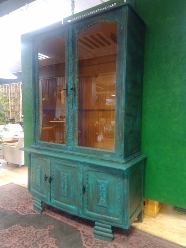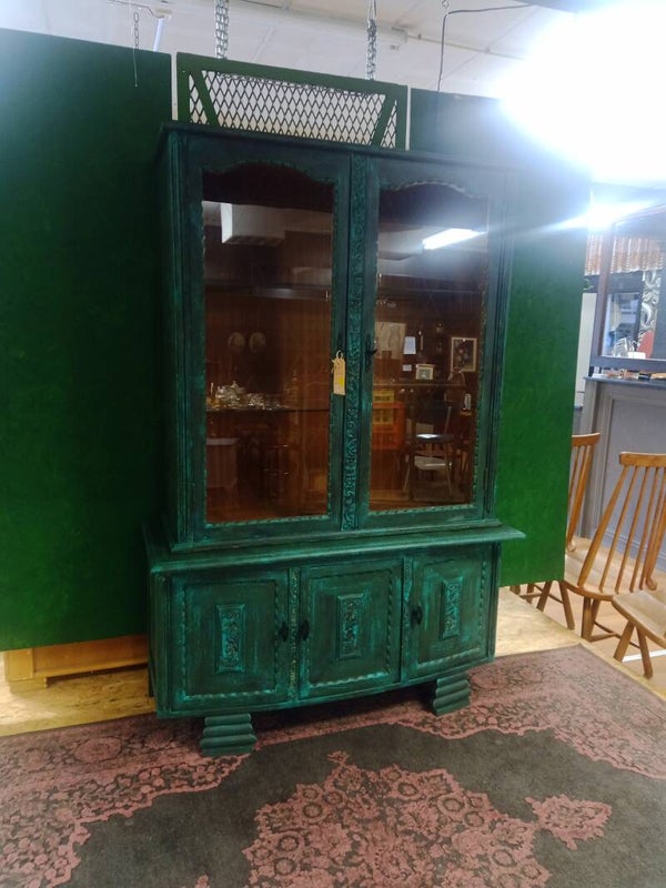 Mooie 2 delige vitrinekast in gevlamde groene kleur