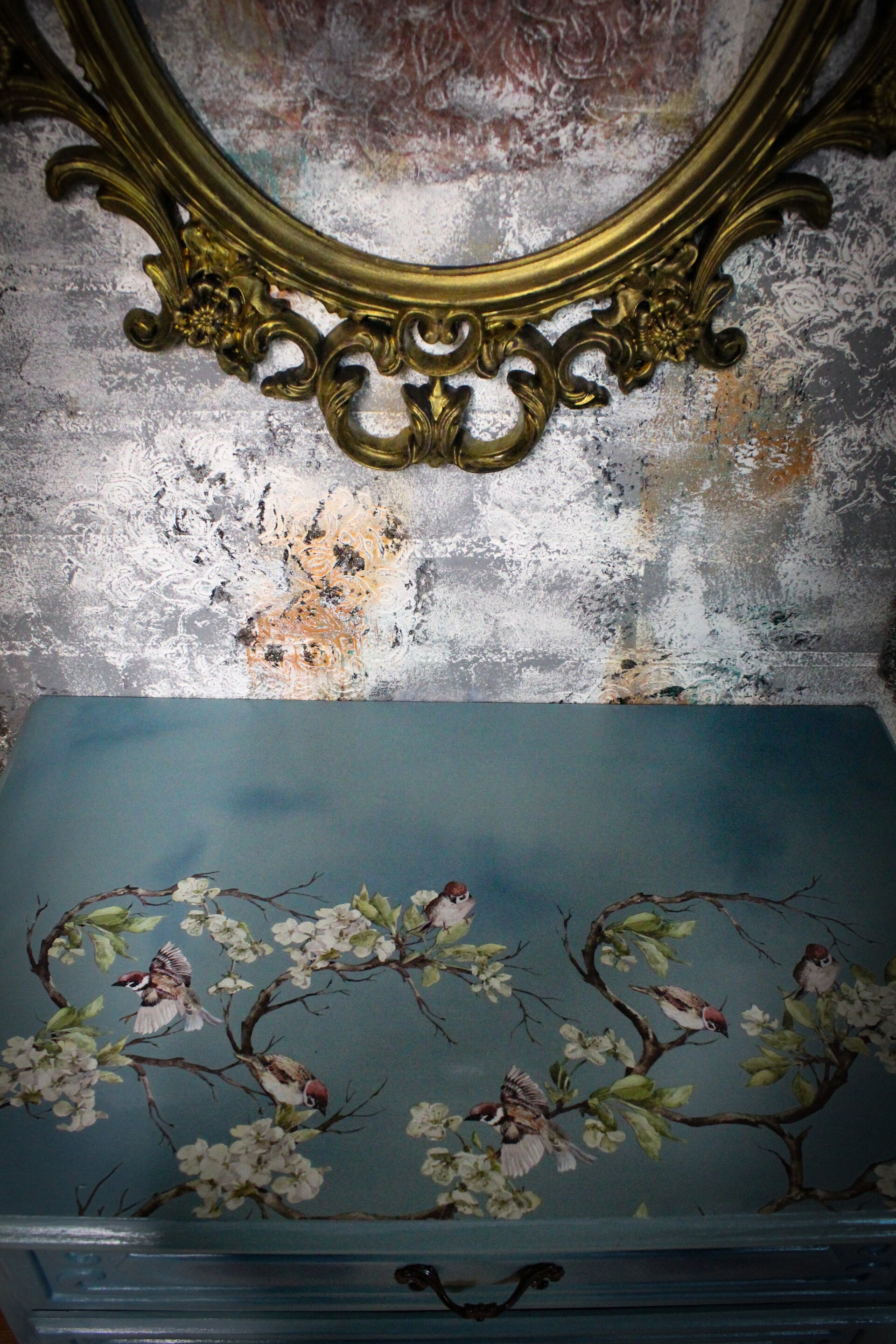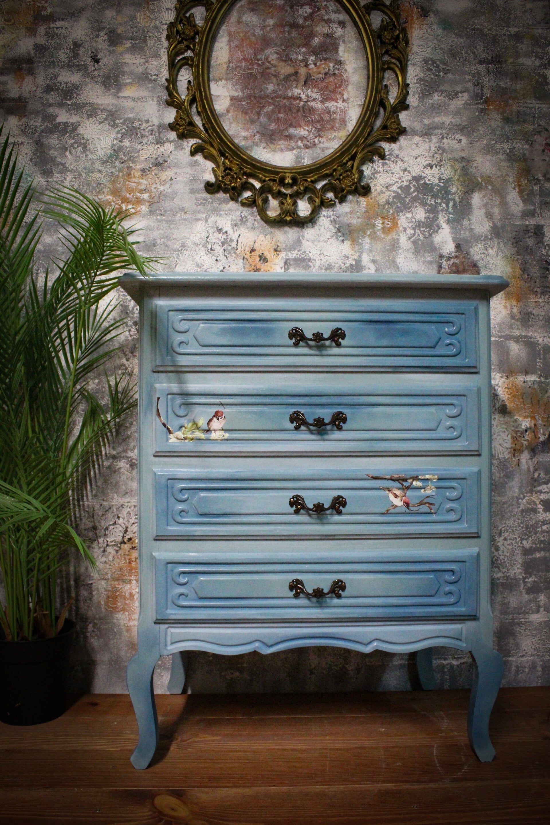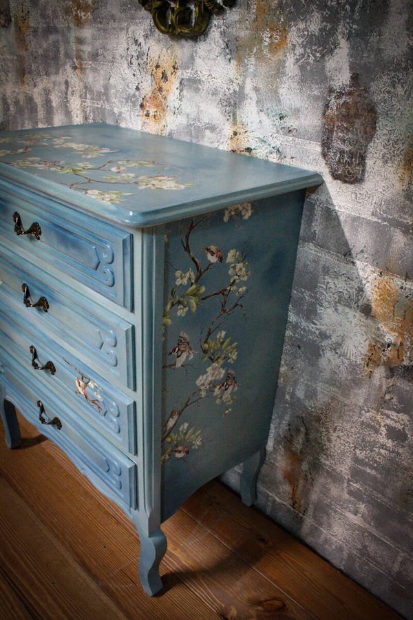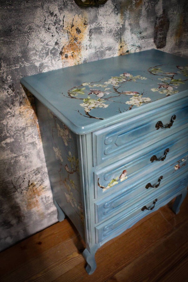 Dit kastje is uniek in zijn soort, ik heb het kastje in verschillende tinten blauw geschilderd zodat het net is alsof je in de wolken bent, de transfer met vogeltjes die ik erop aangebracht heb maken het tot een uniek en mooie kast.