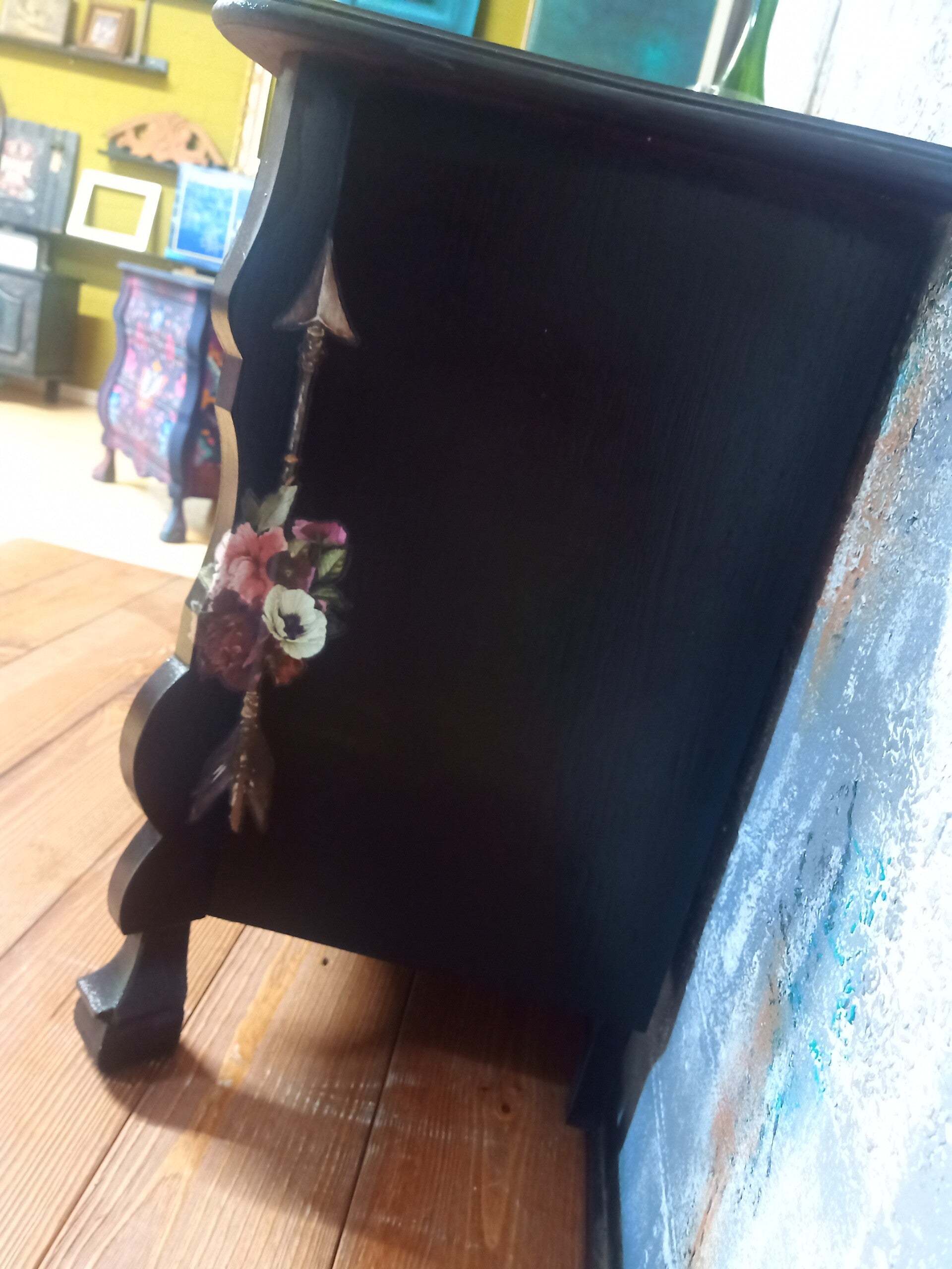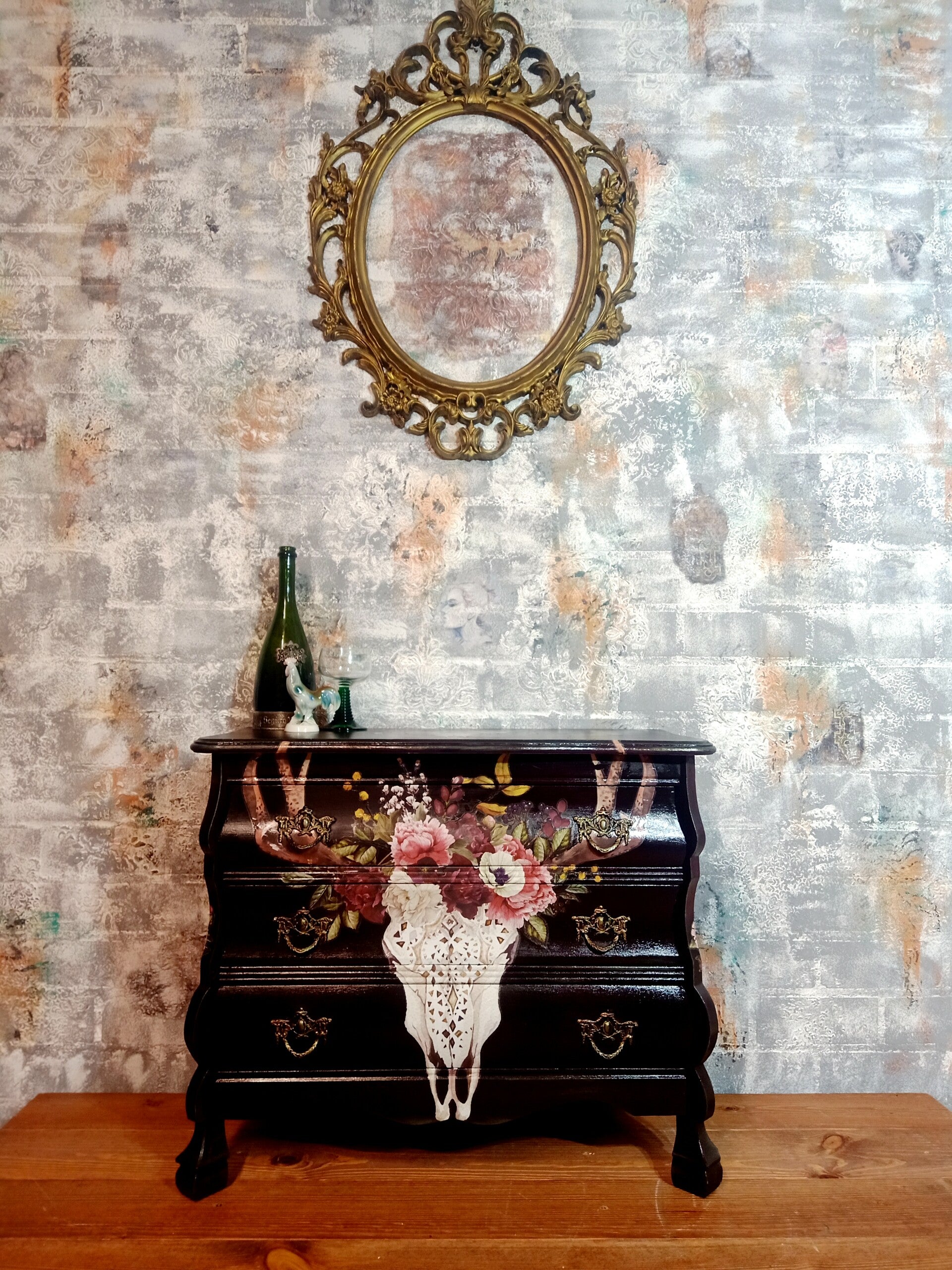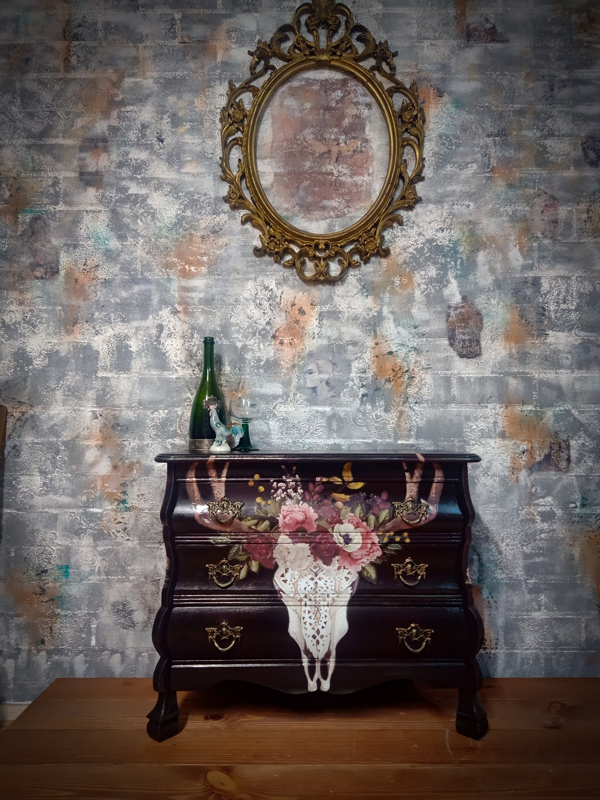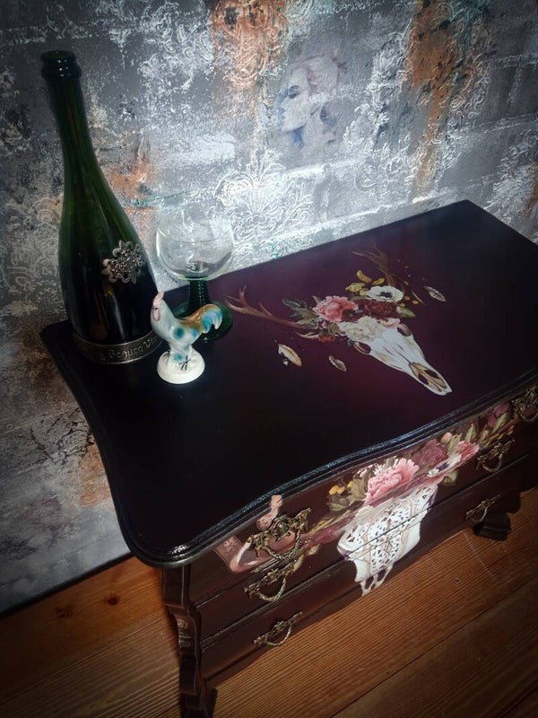 Ladekast geschilderd in een donkerpaarse/aubergine kleur..geblend met een lichtere tint en wat olijfgroene details.