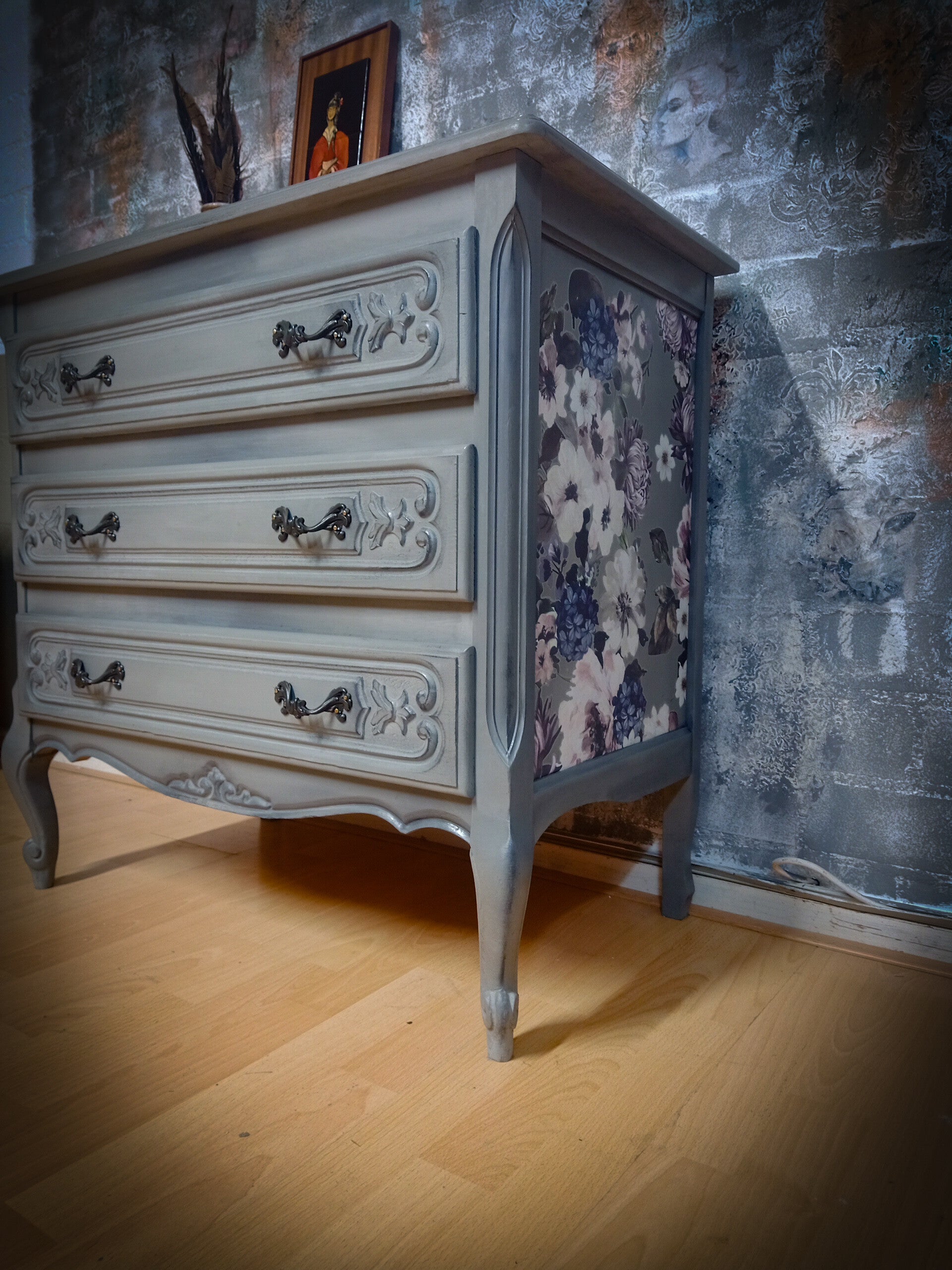 Een prachtige ladekast geschilderd in de kleur Smokey quartz van Wise Owl Paint en de details aangezet met de kleur carbon .. de rest van de kast is licht geblend met deze kleuren.