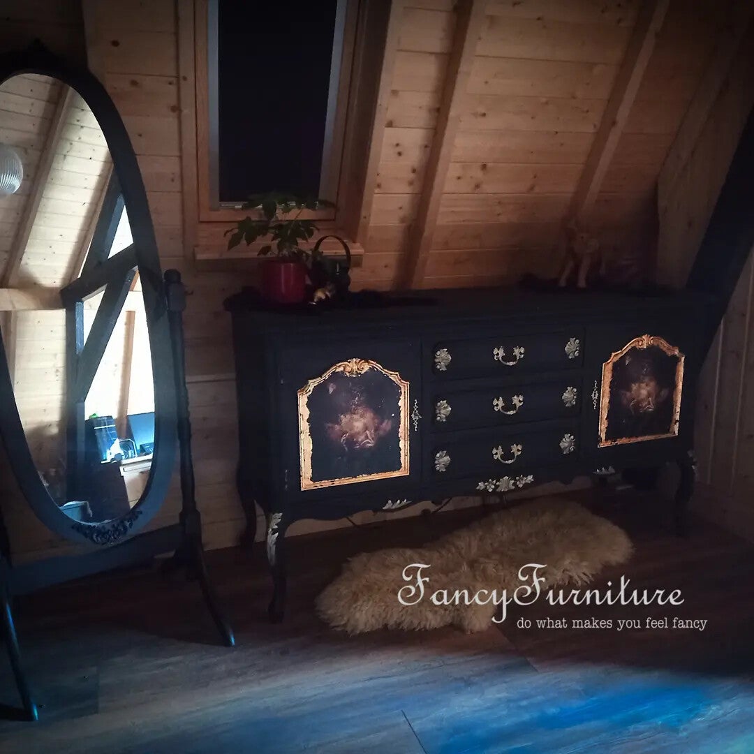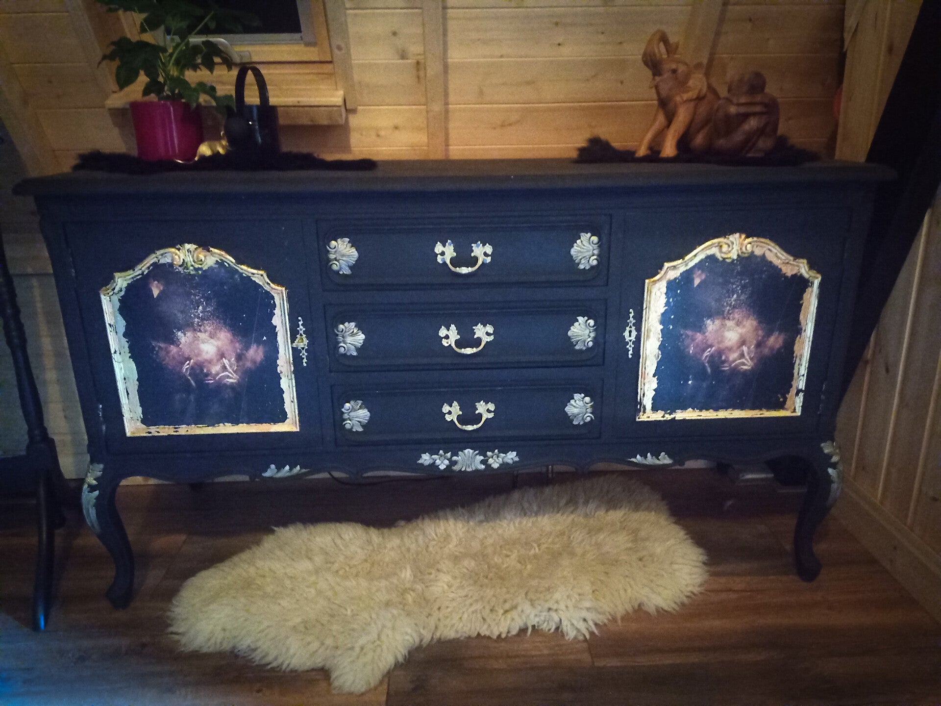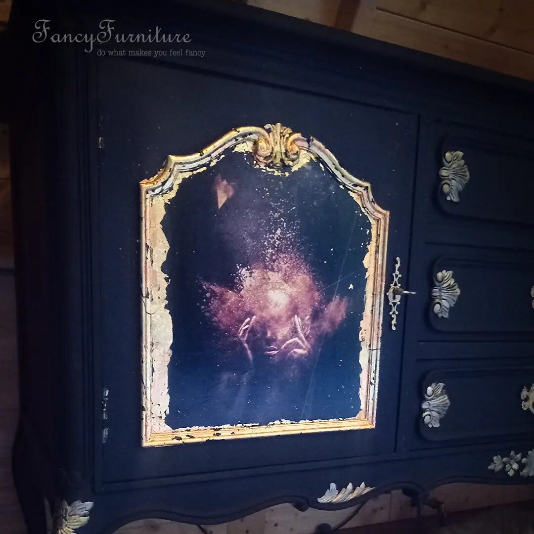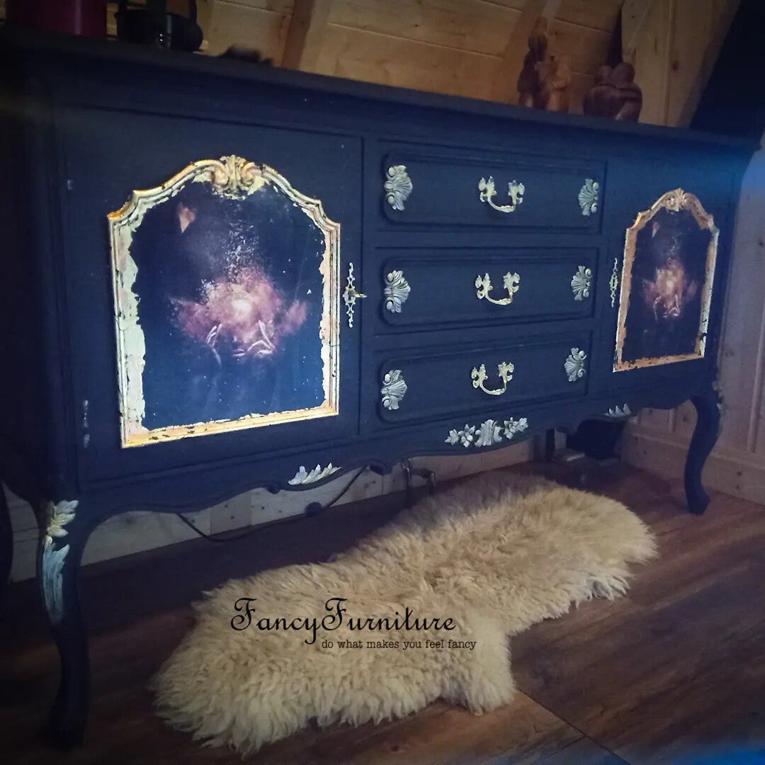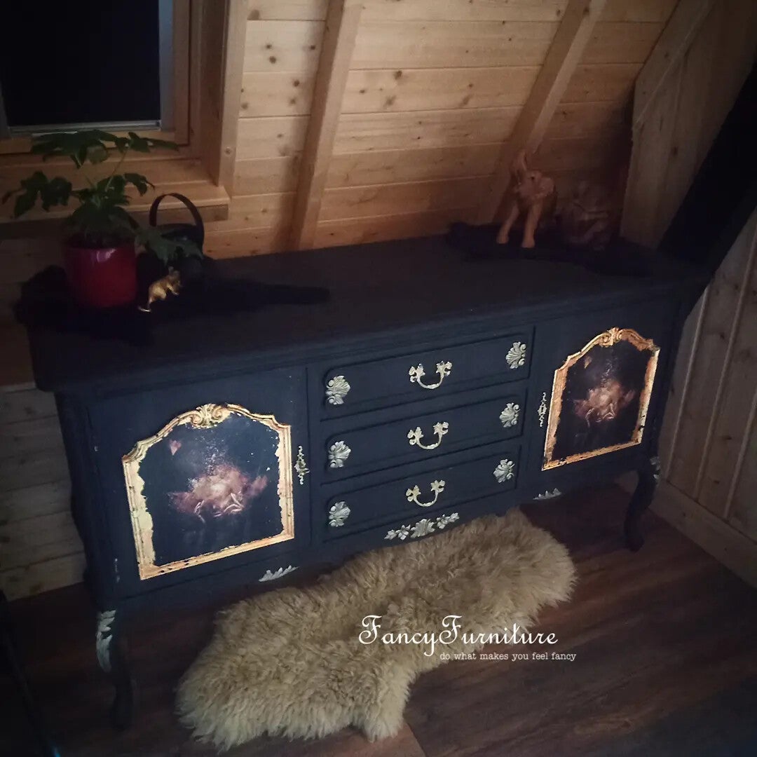 Een prachtig en uniek dressoir...zwart met goud afgezet..twee afbeeldingen van een golden girl afgezet met goldleafs ...Een uniek stuk voor in je interieur Breed 148Diep 54Hoog 86