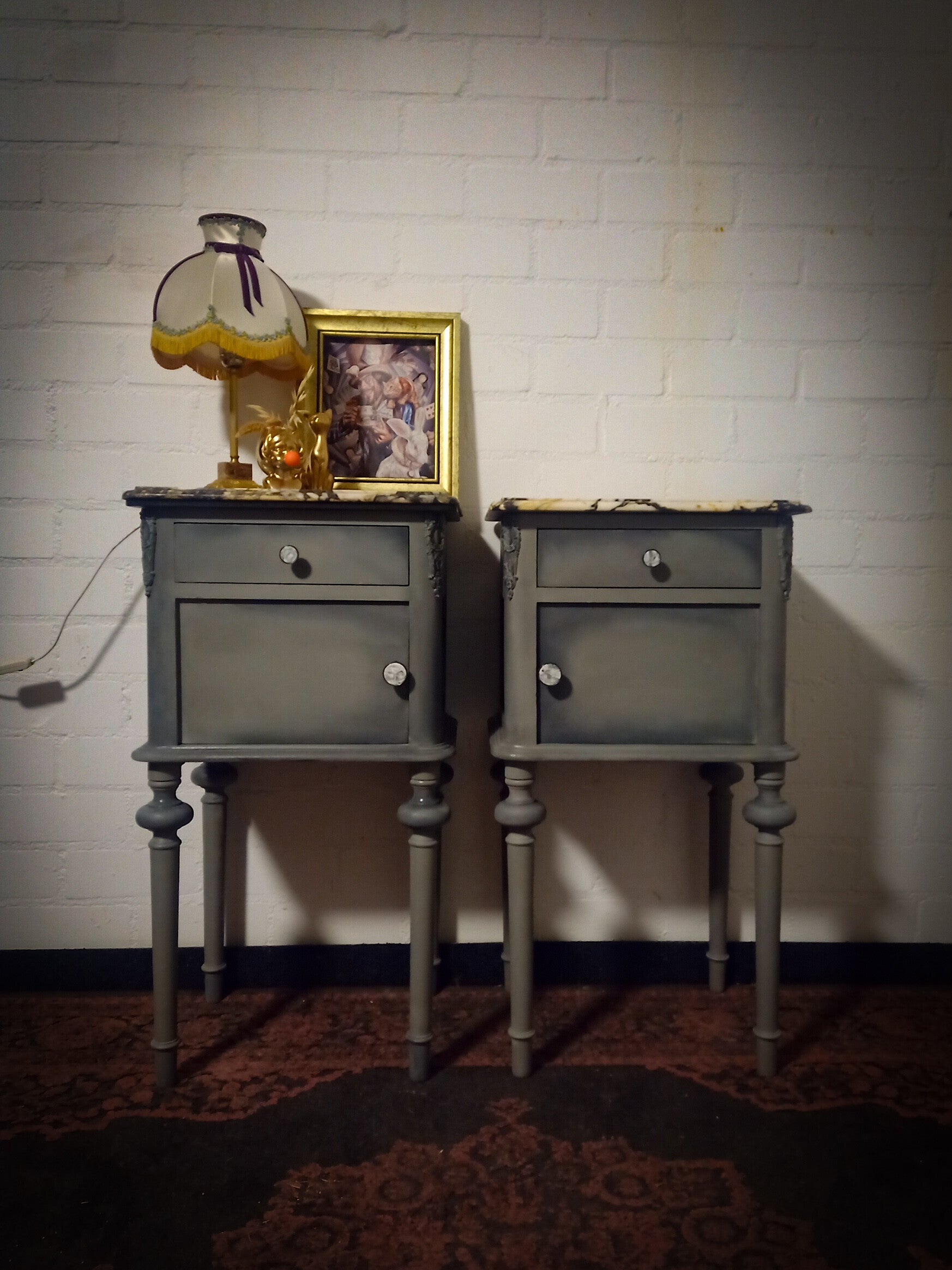 Twee hoge kastjes geblend in twee kleuren grijs...de marmeren platen zijn prachtig gemêleerd