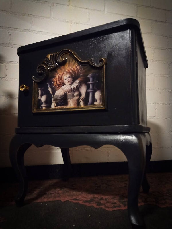 Set nachtkastjes geschilderd in een donkergrijze antraciet kleur de afbeeldingen zijn in de epoxy gezet waardoor je een mooi helder effect hebt.