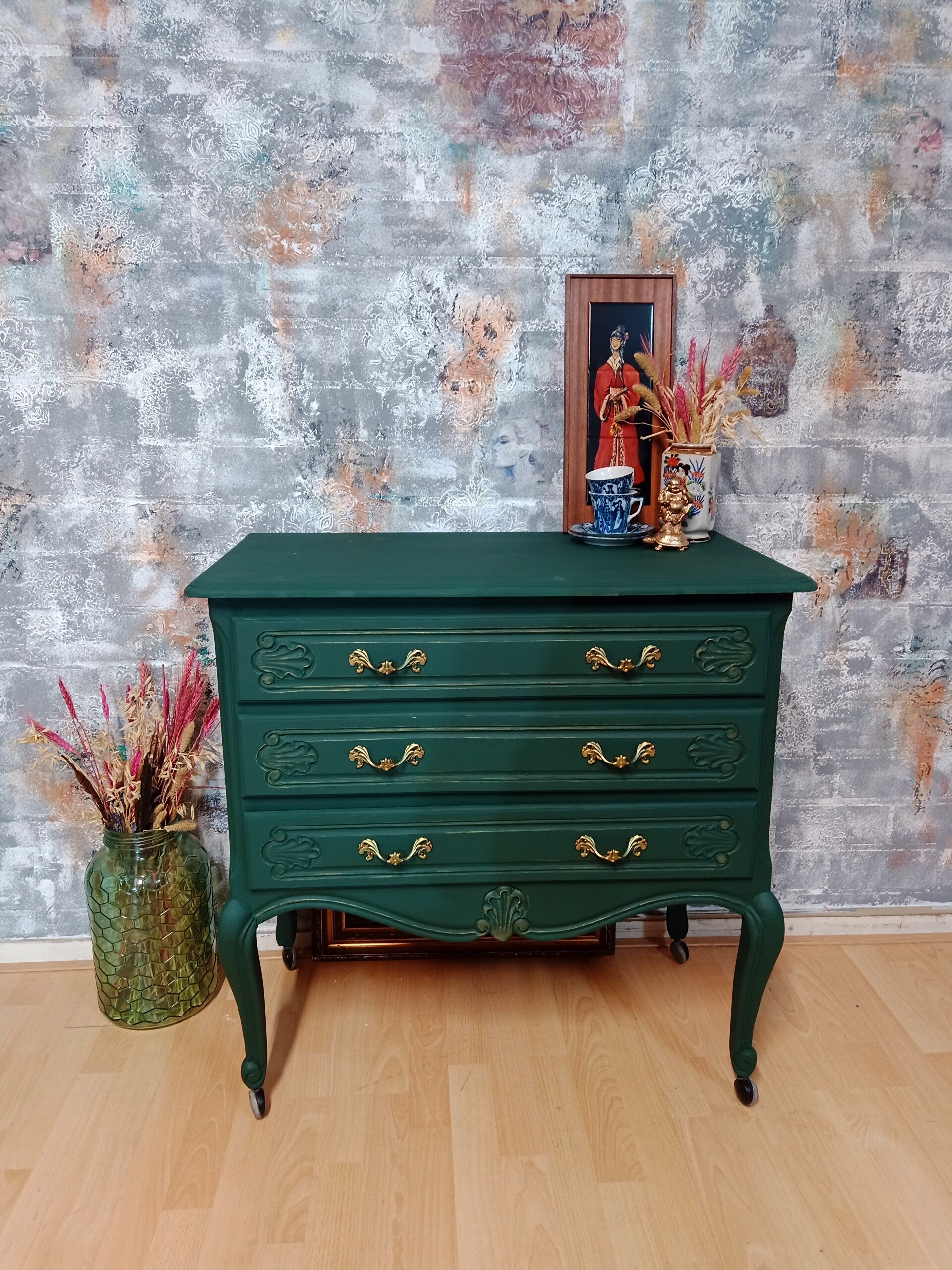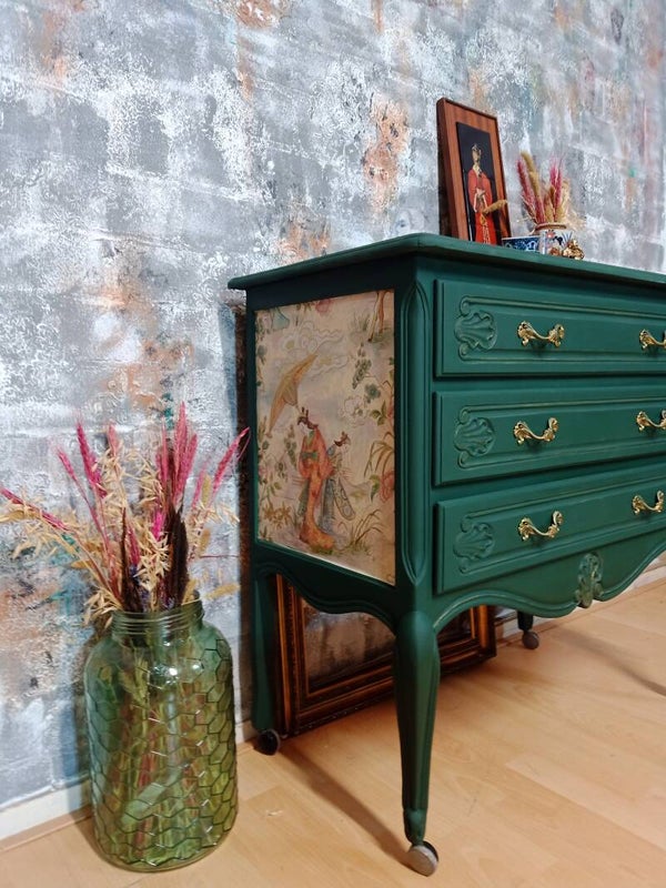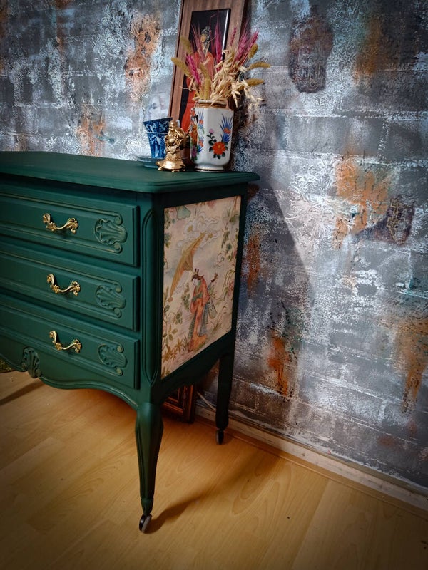 geschilderd in een prachtige donkere groene kleur.de details lichtelijk in het goud gezet.aan beide zijdes een vintage behang met een afbeelding van een China girl.de kast is op wieltjes dus gemakkelijk verrijdbaar.breed 81diep 43hoog 80