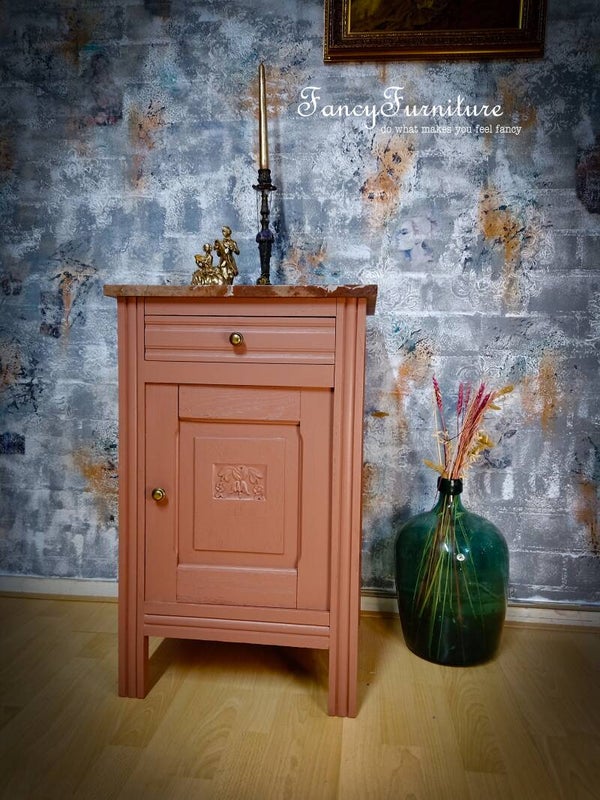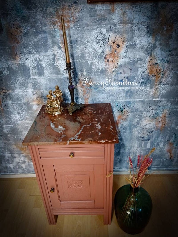 geschilderd in een mooie zachte zalm/terra kleur.een transfer van bloemen en een kraanvogel aan de zijkant.en een prachtig gekleurde marmeren plaat bovenop.breed 48diep 43hoog 76