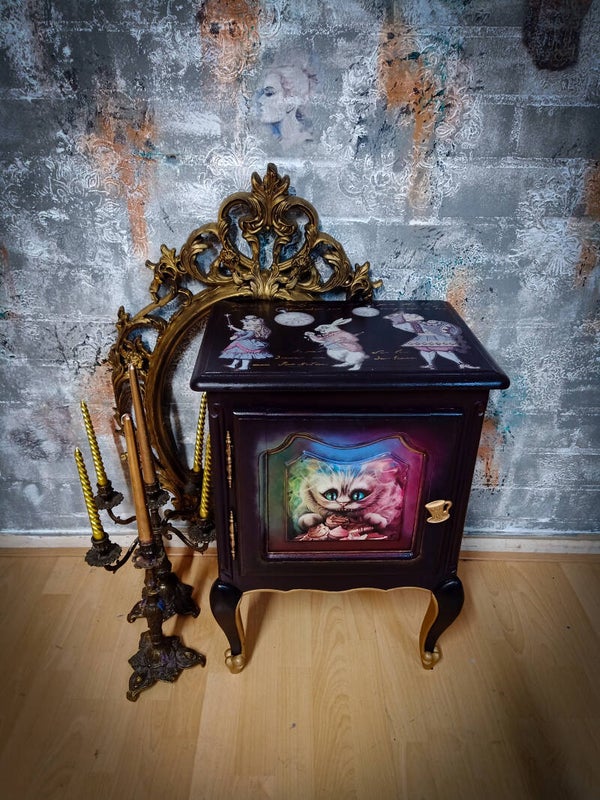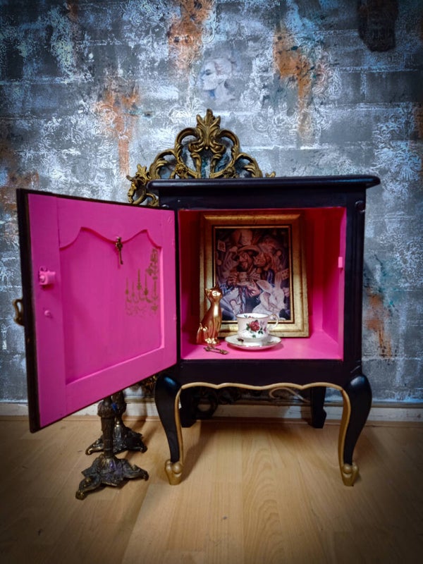 Alice in wonderland kastjegeschilderd in een diep paarse/aubergine kleur, binnenkant knalroze.