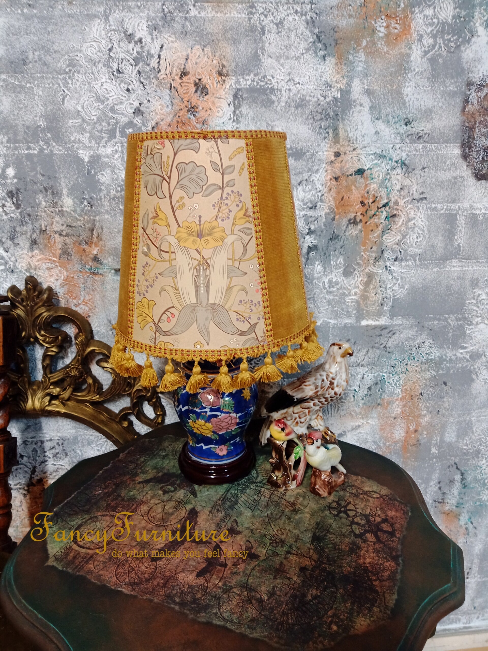 Lamp met voetblauw en okergeel en een transfer op de kap aangebracht