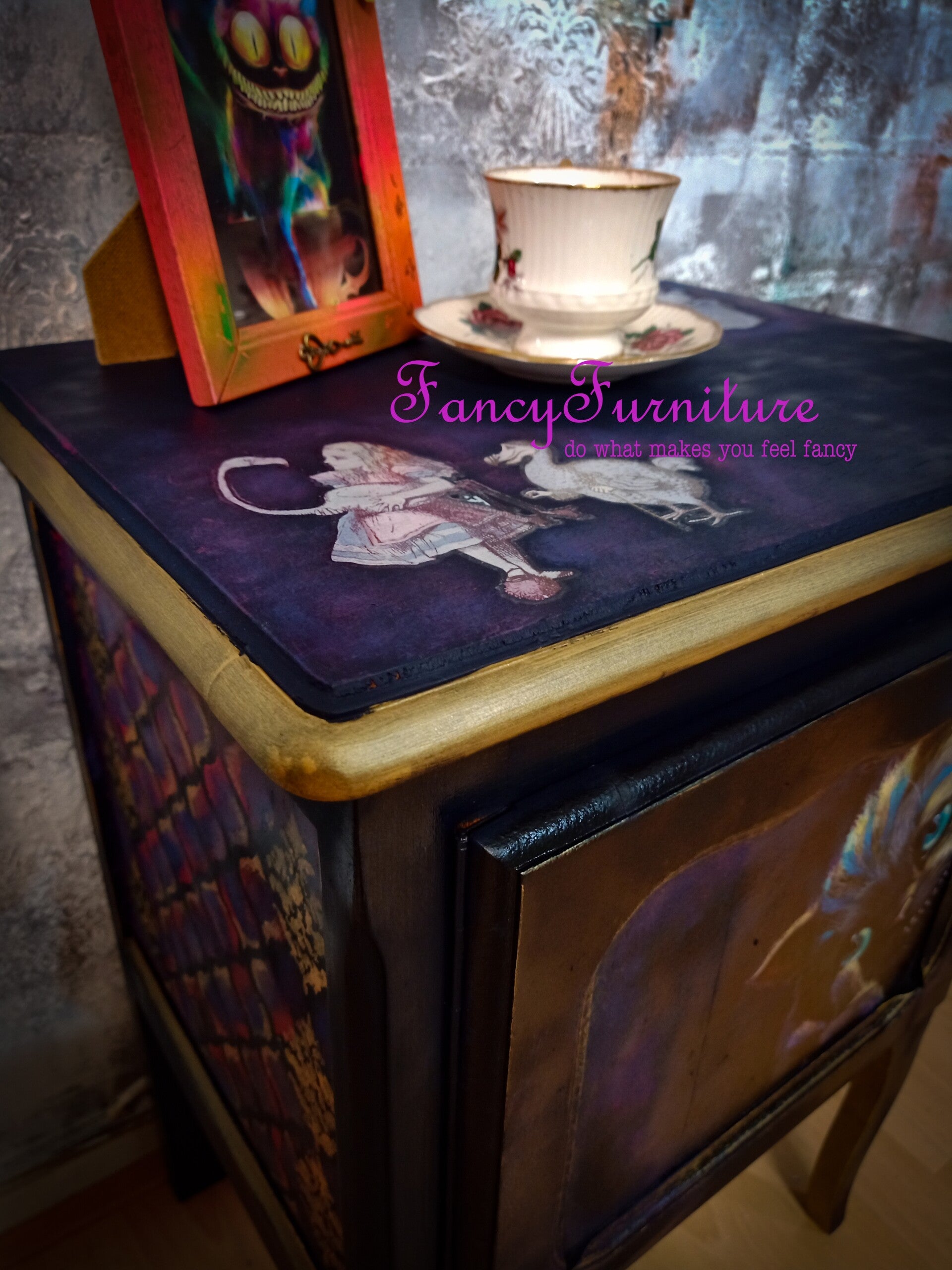 dit kastje is geschilderd in een donkerblauwe kleur genaamd inkwell, daarnaast zijn er op de zijkanten leuke kleurig en gouden details aangebracht, ook bovenop nog wat leuke transfers van Alice herself. de binnenkant is lekker felroze zodat je een mooi contrast krijgt als je het kastje opent, en verder heeft de kast een gouden randje, al met al een uniek kastje.
