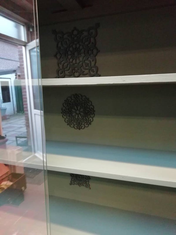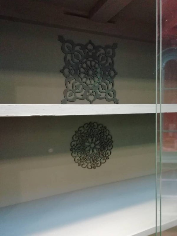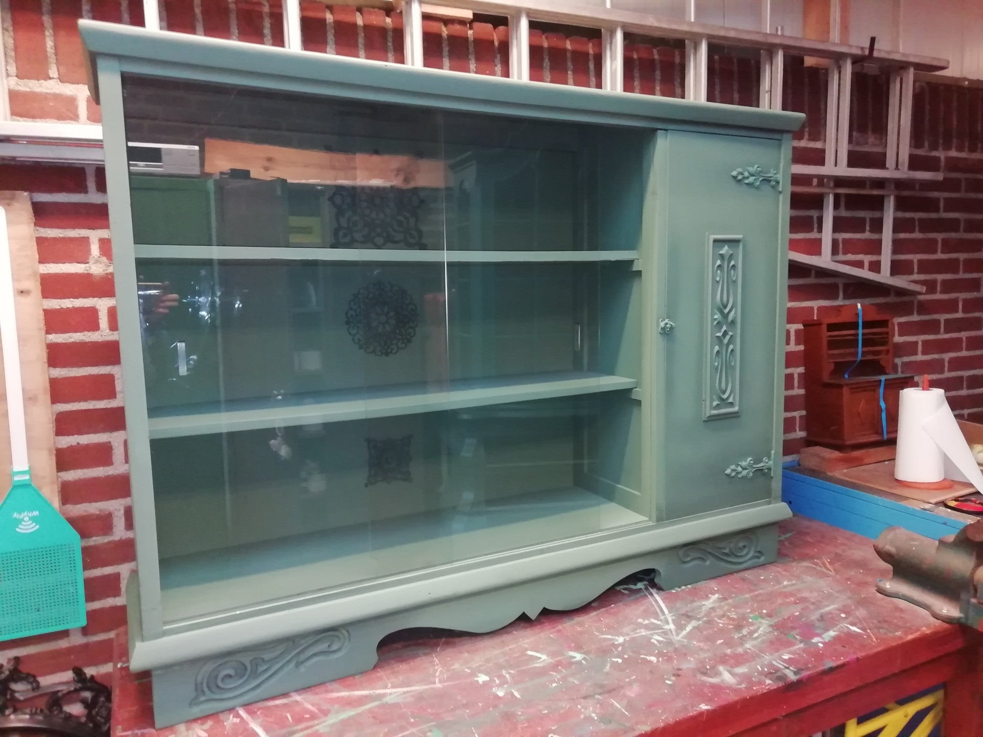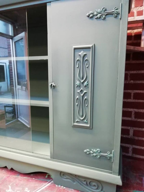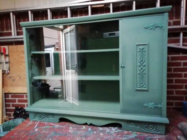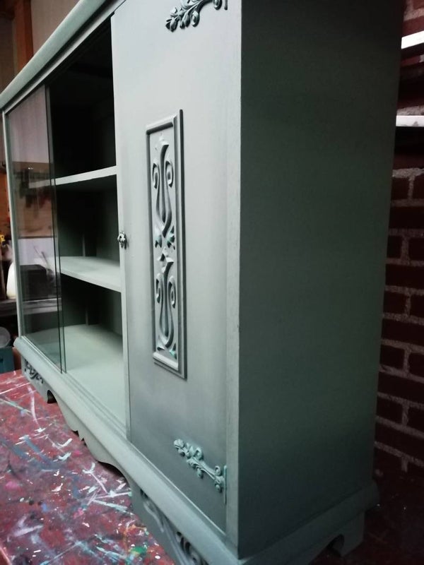 vitrinekastje in de kleur nessie met aan de binnenkant ornamentjes als leuk detail.