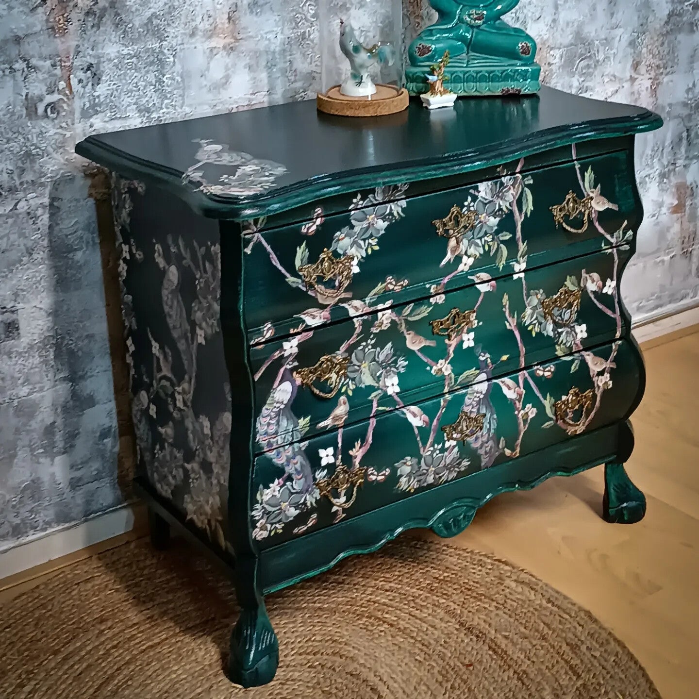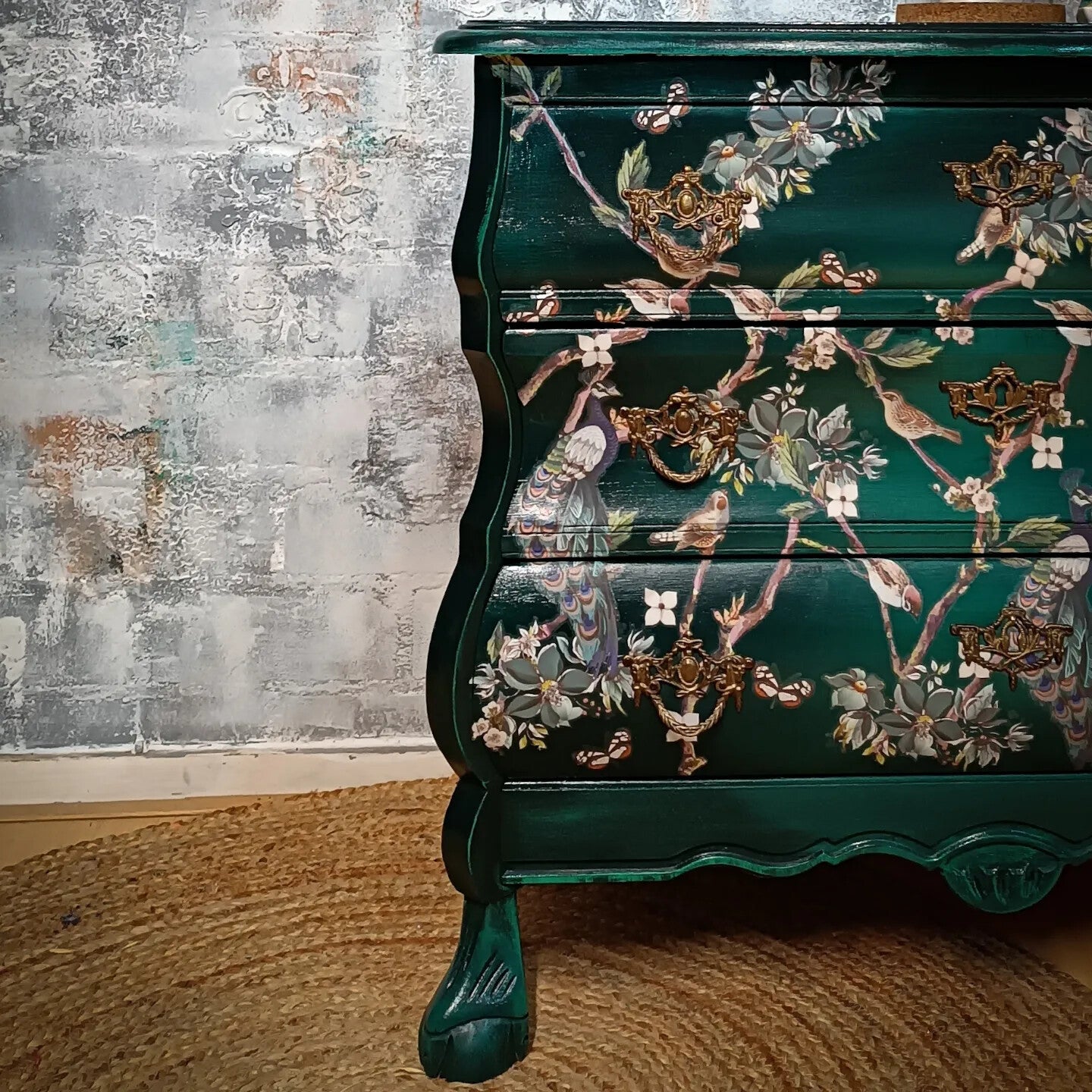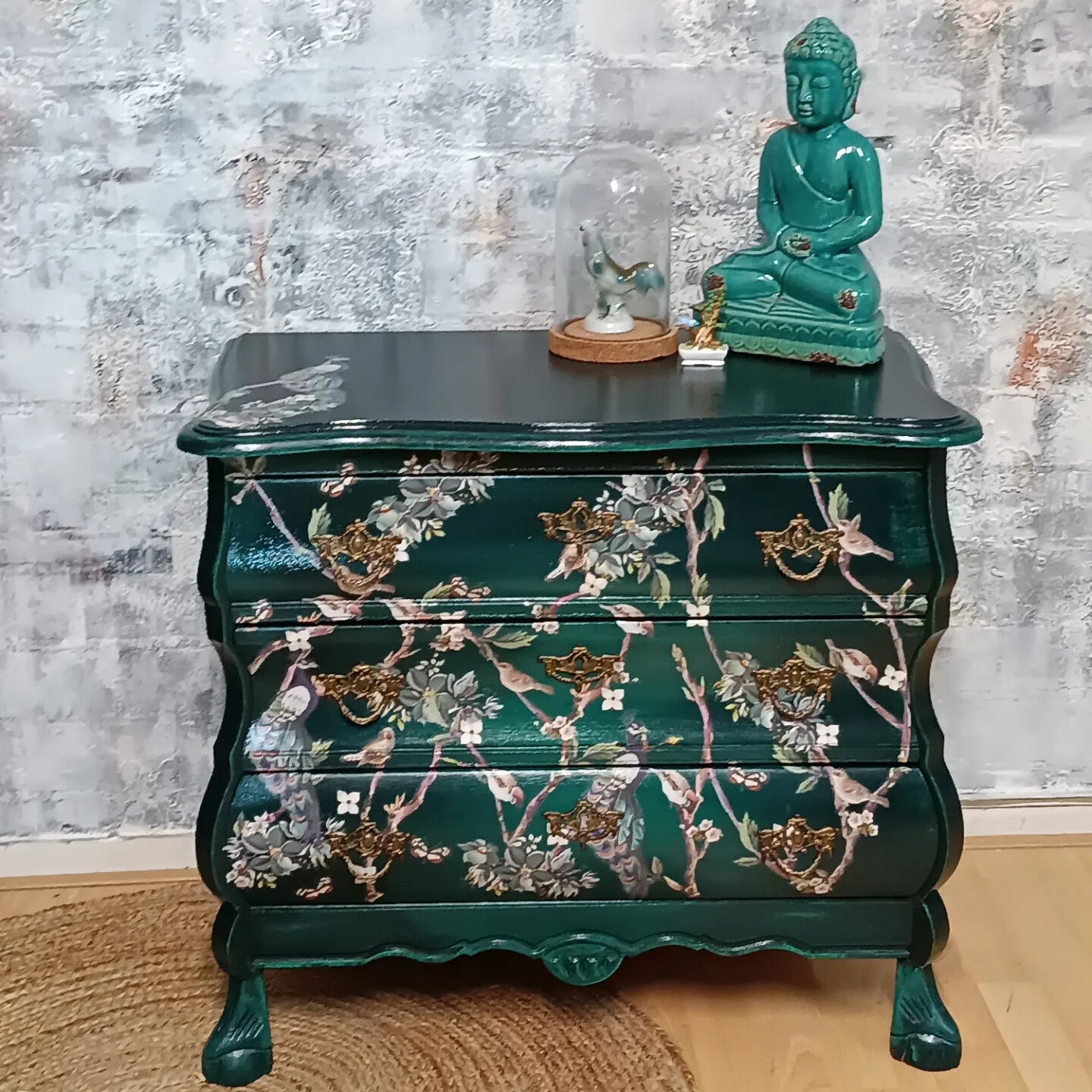 Een mooie buikkast geschilderd in de kleur Charleston green, een mooie diepe donkergroene kleur, geblend met de lichtere kleur emerald green. Op de kast is ook een mooie transfer aangebracht. En het beslag is gekleurd in een mooie gouden tint. Behandeld met Furniture Salve die het meubel beschermt, en de kleurenooi naar voren laat komen.